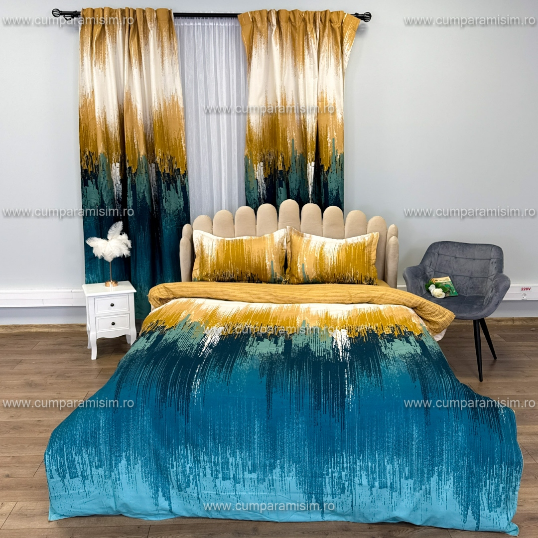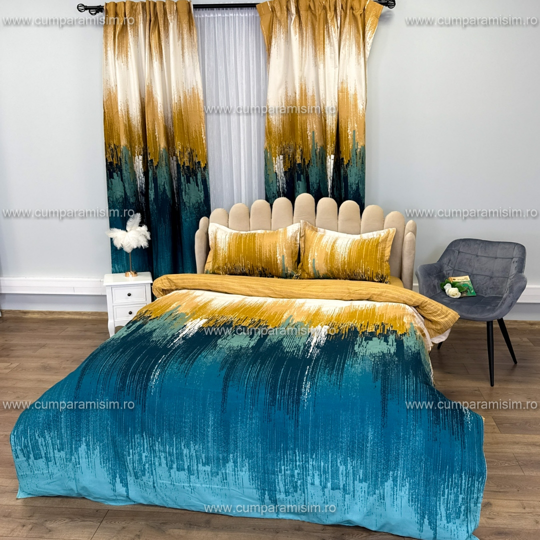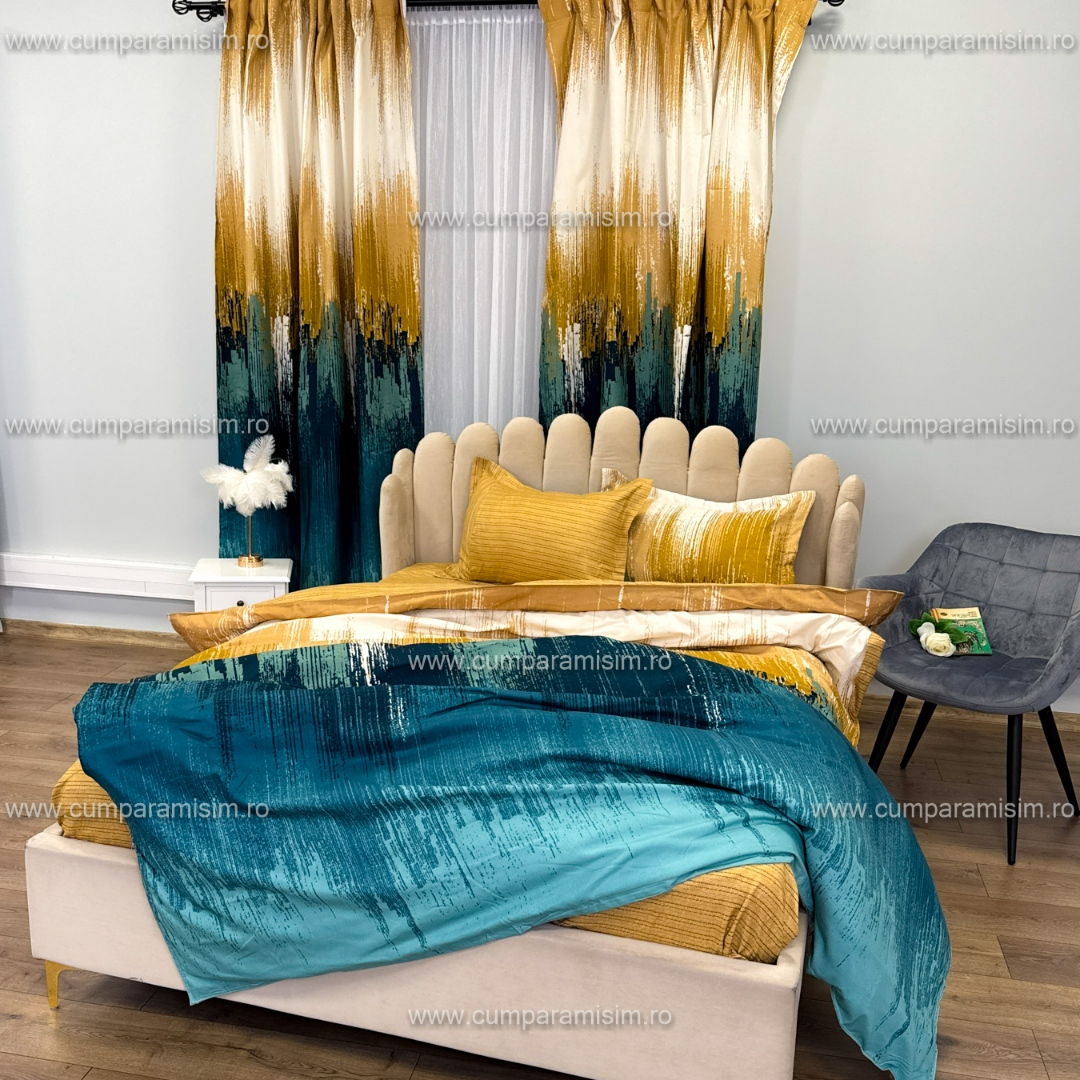 Set lenjerie de pat Matrimonial Compact (saltea 140x200 cm, pilota 160x200 cm) din bumbac finet, 6 piese, cu draperii incluse – Model fluturi Iti prezentam un set complet de lenjerie de pat din finet, format din 8 piese, inclusiv 2 draperii cu rejansa multifunctionala pentru o fixare usoara pe bara, dar si pe sina . Acest set unic are un design elegant si rafinat, care se regaseste atat pe lenjeria de pat, cat si pe draperii, oferind o armonie vizuala perfecta in dormitorul tau. Detal