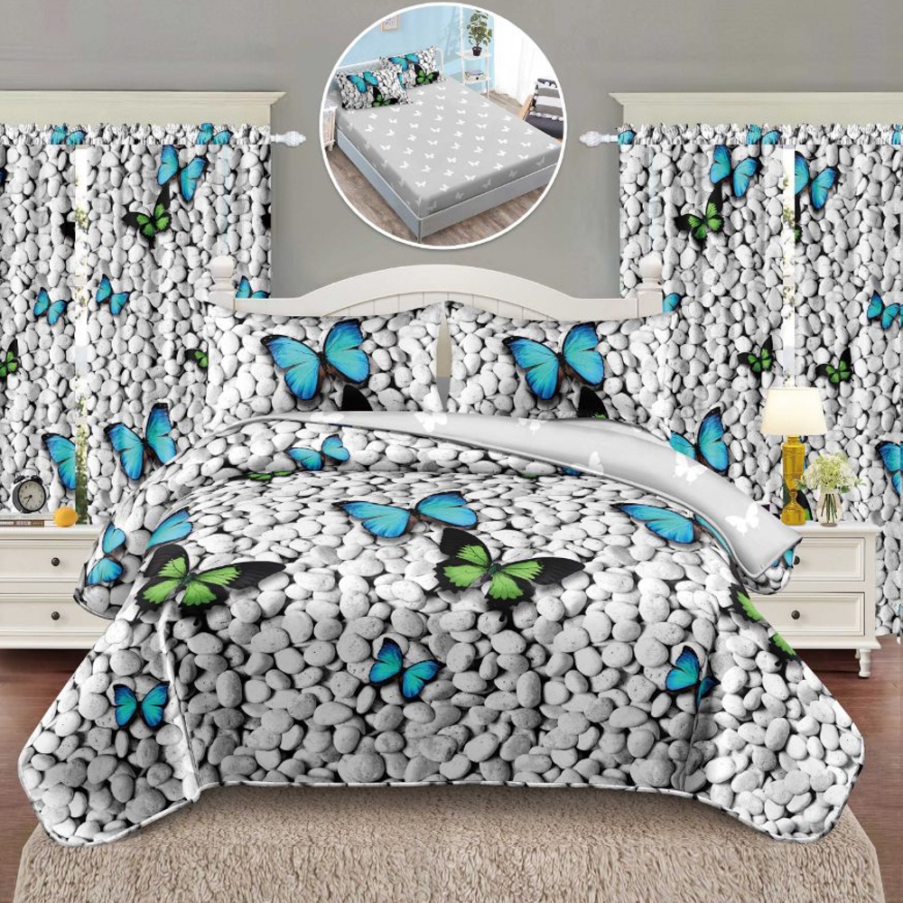 Set Lenjerie pat dublu cu Elastic (140x200cm) + 2 draperii, finet, 6 piese, Gri, Albastru, fluturi