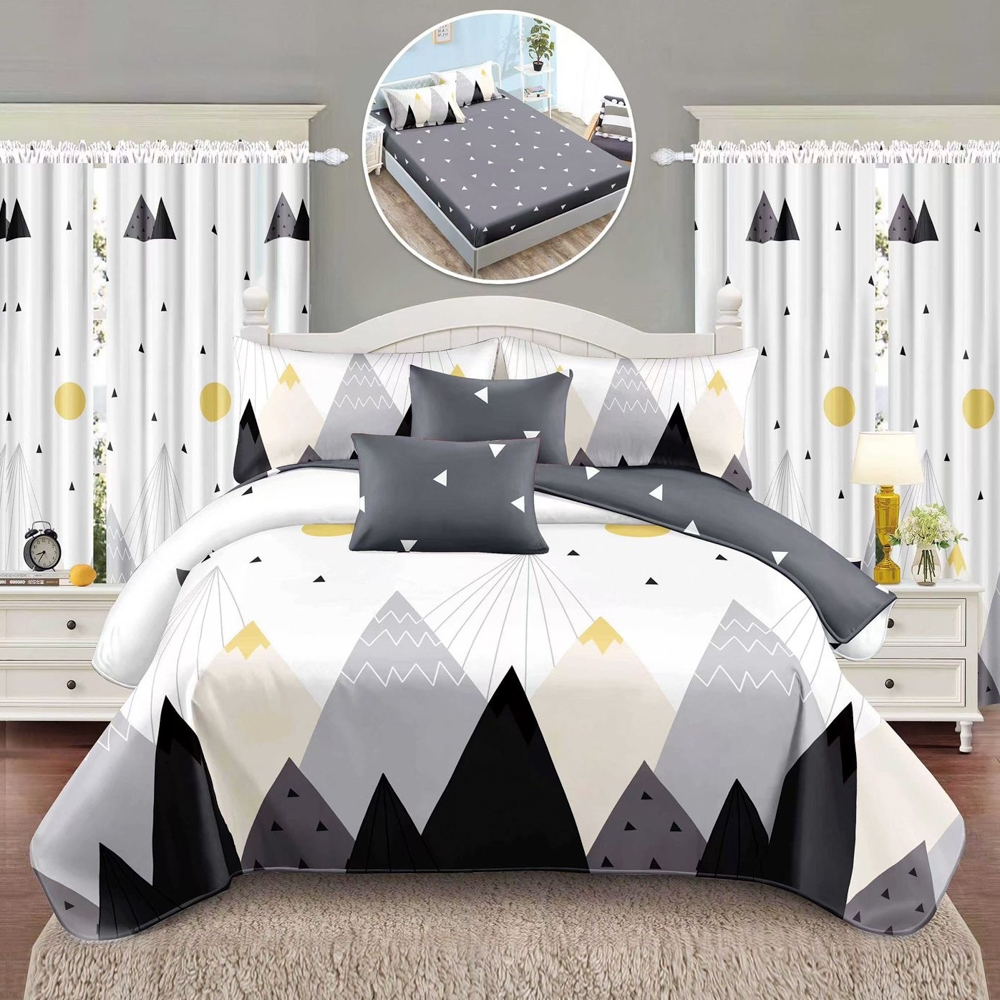 Set Lenjerie pat dublu cu Elastic (160x200cm, 180x200cm) + 2 draperii, finet, 8 piese, Alb, Gri, munti