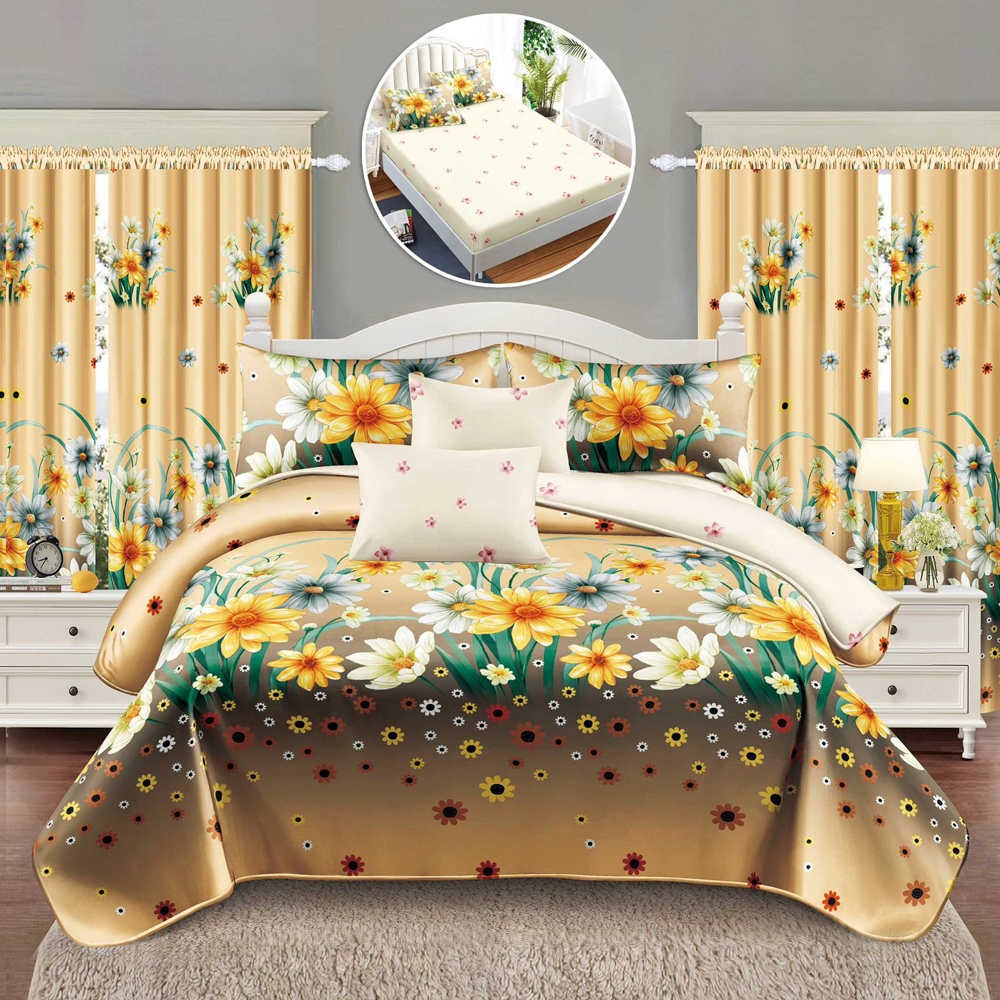 Set Lenjerie pat dublu cu Elastic (160x200cm, 180x200cm) + 2 draperii, finet, 8 piese, Bej, Maro, flori