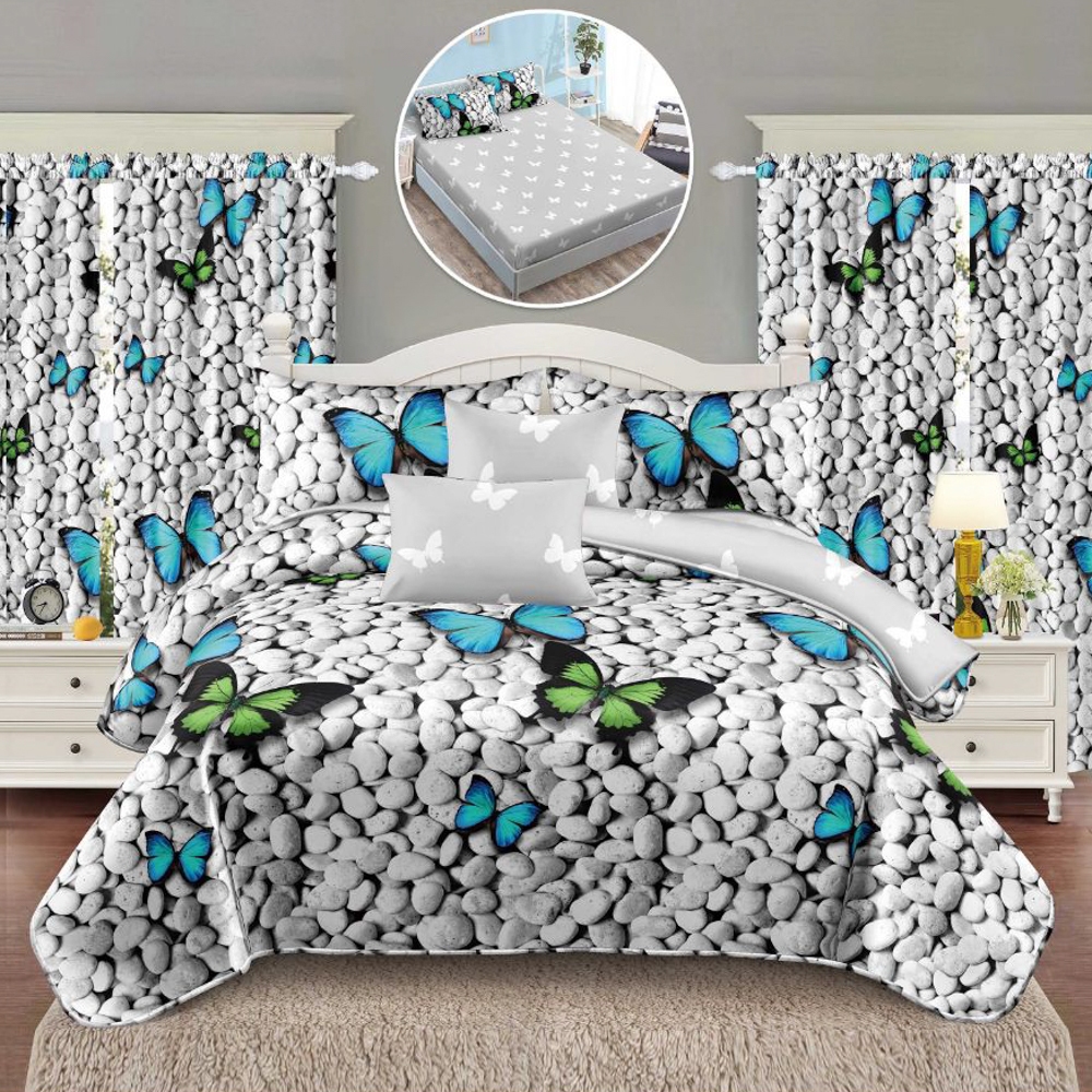 Set Lenjerie pat dublu cu Elastic (160x200cm, 180x200cm) + 2 draperii, finet, 8 piese, Gri, Albastru, Fluturi