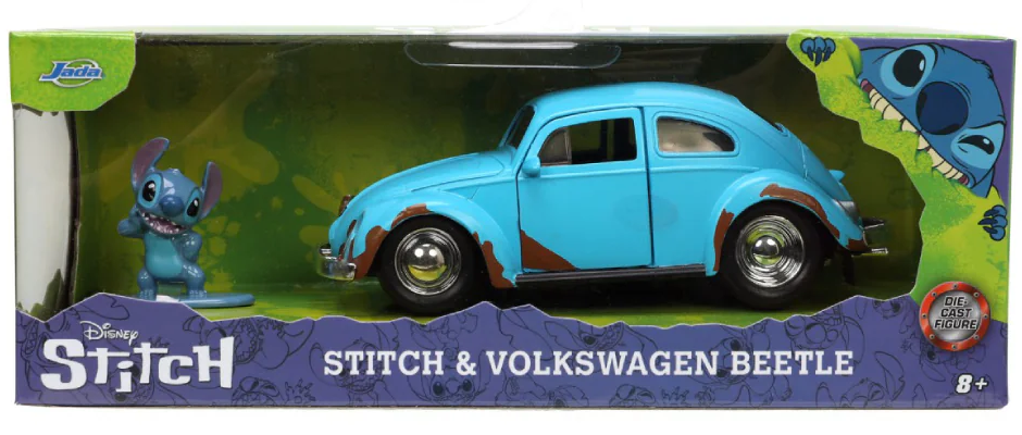 Masinuta din metal Volkswagen Beetle, cu usi ce se pot deschide. Setul include si o figurina Stitch din metal.