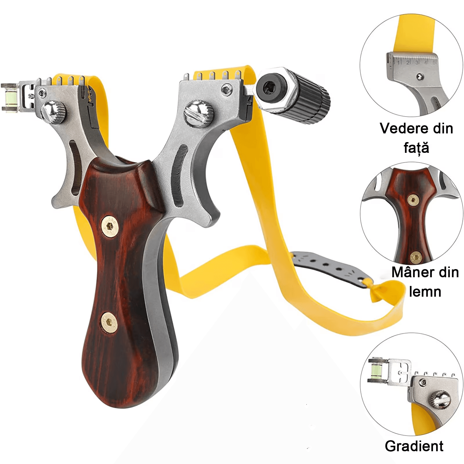 Aceasta prastie este conceputa pentru precizie si durabilitate, fiind ideala pentru activitati sportive si de tragere la tinta./nCaracteristici prastie:/nConstructie rezistenta: Prastie metalica robusta, cu un maner ergonomic acoperit cu lemn pentru o prindere sigura si confortabila./nPerformanta superioara: Cauciucul din latex este foarte elastic si rezistent, avand un capat antiaderent pentru o lansare eficienta./nPrecizie imbunatatita: Echipata cu laser rosu si boloboc pentru o aliniere corecta si o tintire mai precisa./nAccesorii incluse: Vine cu trei benzi de cauciuc (doua de rezerva), un imbus si o cheie pentru montaj./nDimensiuni prastie:/nLungime: 11.5 cm/nLatime: 8.5 cm/nGreutate: 170 g/nIn functie de stoc, baza poate sa difere usor./nBile metalice pentru prastie:/nMaterial: Metal/nDiametru: 8 mm/nGreutate per bila: 2 g/nCantitate per set: 3 x 100 bucati/nAplicatii: Potrivite exclusiv pentru prastii profesionale, destinate tragerii la tinta./nUn set complet pentru cei care cauta precizie, putere si durabilitate intr-o prastie profesionala.