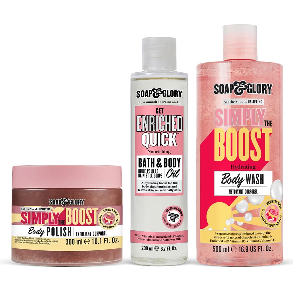 Set perfect pentru ingrijirea pielii. Hidrateaza, hraneste si protejeaza pielea uscata si terna.Setul contine:✔ Gel de Dus Soap & Glory Simply The Boost Body Wash ✔ Exfoliant de Corp Soap & Glory Simply The Boost Body Scrub ✔ Ulei de Baie Soap & Glory Original Pink Bath & Body Oil Gel de Dus IL IUBIM PENTRU CA ESTE:✔Hidratanta ✔Hranitoare ✔Delicata ✔Testata dermatologic CE FACE: Hraneste si hidrateaza, catifeleaza si netezeste, lasand pielea curata si parfumata. Previne deshidratarea pielii uscate, se absorabe rapid si are un efect revigorant. Textura este cremoasa, parfumul de lunga durata, iar cantitatea de gel este potrivita pentru 100 de spalari.Datorita extractului de grapefruit si rubarba, gelul imbunatateste aspectul pielii si ofera un miros placut. Puternic nutritiva, calmeaza si regeneraza, readucand stralucirea naturala. Formula bogata in ingrediente hranitoare improspateaza si lumineaza, fiind un adevarat rasfat pentru toate tipurile de piele.Îmbogățita cu substanțe care salvează pielea, cum ar fi multi-vitaminele B5, C și E, acest gel îndepărteaza murdăria, uleiurile și impuritățile pentru o piele extrem de curată, care se simte revigorată și revitalizată.FORMULA IMBOGATITA CU: ✔Grapefruit - contine fier, vitamina K si vitamina E, un antioxidant puternic ce contribuie la regenerarea pielii si la prevenirea imbatranirii premature a acesteia. ✔ Rubarba - pot ajuta la reducerea iritației pielii, a roșeții pielii și a umflăturilor. Aplicarea ceaiului verde pe piele poate calma tăieturile minore și arsurile solare.CUM IL FOLOSIM: Aplicati o cantitate potrivita in palme sau pe burete si distribuiti uniform pe pielea umeda prin miscari circulare pana la formarea spumei, apoi clatiti. Poate fi folosit si ca spumant de baie.De asemenea, pentru a menține pielea sănătoasă și catifelată este recomandat ca de minim 2/săptămână să urmezi un ritual de exfoliere. ExfoliantIL IUBIM PENTRU CA ESTE: ✔Hidratant ✔Hranitor ✔Revitalizant ✔Vegan CE FACE: Energizant si hidratant, scrub-ul combină nuca, vitamina B5, C si E pentru a vă lăsa pielea supla, catifelata si stralucitoare inca de la prima utilizare. Mirosul este incarcat de grapefruit si rubarba pentru o experiență parfumată de neuitat.Este ideal pentru pielea uscata si deshidratata. Indepărtează celulele moarte, stimulează microcirculația, curăță și netezește, ajutand la prevenirea firelor de sub piele. Imbuntateste fermitatea, elasticitatea si tonusul pielii. Formula cu micro-particule exfoliante stimuleaza micro-circulatia sangvina ajuta la reducerea si combaterea celulitei, in timp ce ingredientele naturale active asigura pielii o ingrijire completa. FORMULA IMBOGATITA CU: ✔Grapefruit - contine fier, vitamina K si vitamina E, un antioxidant puternic ce contribuie la regenerarea pielii si la prevenirea imbatranirii premature a acesteia. ✔ Rubarba - pot ajuta la reducerea iritației pielii, a roșeții pielii și a umflăturilor. Aplicarea ceaiului verde pe piele poate calma tăieturile minore și arsurile solare. ✔Nuca - are un continut ridicat de vitamina E, care este cunoscuta in mod obisnuit ca vitamina frumusetii si ajuta la pastrarea pielii stralucitoare si netede. CUM IL FOLOSIM: Aplicati o cantitate potrivita pe piele si masati delicat prin miscari circulare. Clatiti cu apa calduta. Se repeta procesul de 2-3 ori pe saptamana. Ulei de BaieIL IUBIM PENTRU CA ESTE: ✔Hidratant ✔Hranitor ✔Relaxant ✔Vegan CE FACE: Infuzat cu ulei de argan, vitamina E, ulei de sofran si migdale dulci, aceasta formula usoara aluneca pe piele, curata si hidrateaza intens. Textura unica, revigoreaza pielea si ofera stralucire, lasand-o catifelata si neteda.Amestecul revigorant de ingrediente naturale hraneste pielea deshidratata. Uleiul este placut parfumat, dulce, cu note de trandafir si bergamota, mirosul rezistand timp indelungat pe piele. Uleiul poate fi folosit direct pe piele, sau ca spumant pentru o baie relaxanta si linistitoare.FORMULA IMBOGATITA CU: ✔Ulei de argan - Vitamina E si acizii grasi din uleiul de argan sunt excelenti pentru repararea pielii deteriorate. Uleiul de argan contine si ingrediente care calmeaza pielea. Cateva picaturi si masarea usoara a pielii afectate vor face minuni. ✔Vitamina E - nu opreste procesul de imbatranire, ci il incetineste, ii diminueaza efectele. ✔Migdale dulci - fiind bogate in vitaminele A si E, acesta ajuta la intarirea pielii, oferind fermitate acesteia, si la prevenirea aparitiei ridurilor. Uleiul de migdale dulci poate fi utilizat si pentru reducerea inflamatiilor si iritatiilor pielii, dar si pentru combaterea vergeturilor si a cicatricilor. ✔Ulei de sofran - ajuta la calmarea pielii si ofera un aspect catifelat si neted. CUM IL FOLOSIM: Aplicati uleiul pe piele si masati usor pana devine spuma. Clatiti cu apa calduta. Se poate folosi si ca spumant. Turnati produs sub jetul de apa si relaxati-va intr-o baie calda.