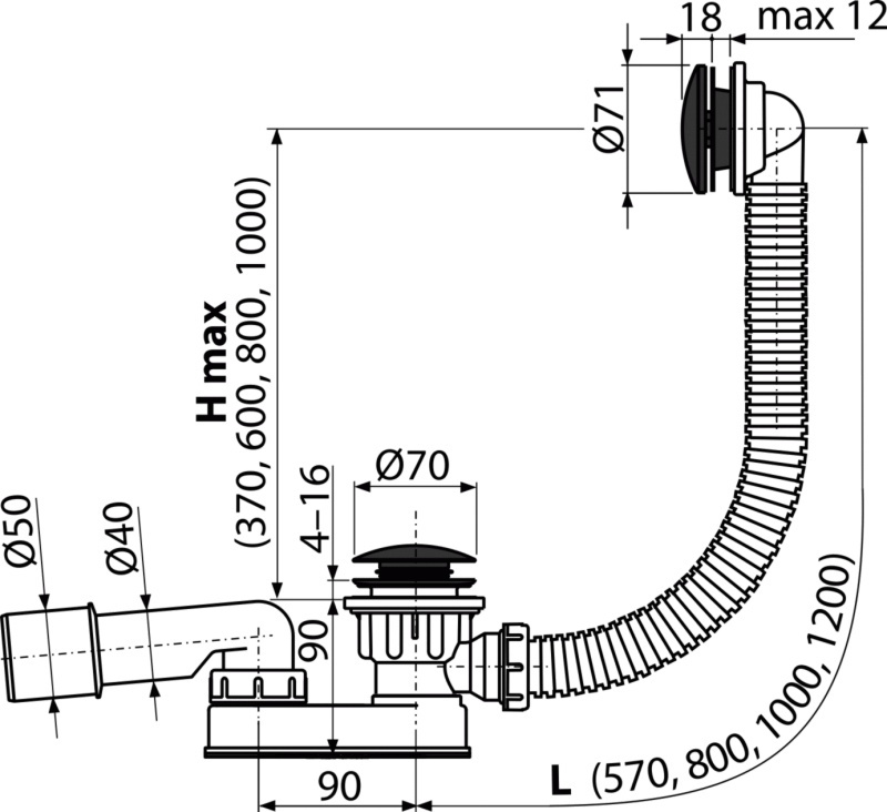 Aplicabilitate: Pentru a evacua apa din cadă Pentru căzi de baie cu dimensiuni standard Pentru căzi de baie cu scurgere de Ø52 mm Caracteristici / Specificatii Tehnice: Legătură pentru cadă cu preaplin Sifon anti miros umed cu cot rotativ Închiderea sifonului prin mecanism CLICK/CLACK Preaplin cu țeavă flexibilă Înălțime de instalare redusă Lungime sifon cadă 57 mm Culoare: negru-mat Material: metal finisaj negru-mat Sifon ușor de curățat- datorită evacuării care este complet detașabilă Sifon anti miros 50 mm Debit 48,6 l/min Debit 42 l/min Rezistența sifonului anti-miros la presiune 588 Pa Rezistența termică 95 ˚C