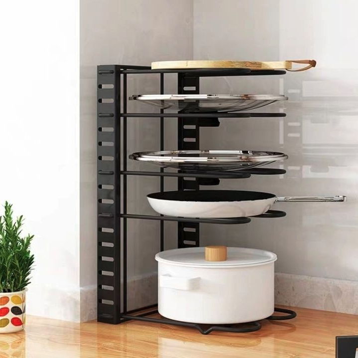Suport reglabil pentru oale, capace si tocatoare Dimensiuni produs: 30 x 20 x 42 cm Culoare: negru Greutate: 1.5 kg 5 niveluri reglabile Suportul a fost conceput folosind metal de calitate premium si durabil, astfel incat pot fi depozitate tigaile fara ca suportul sa se indoaie. Suportul este, de asemenea, foarte stabil. Suportul a fost conceput pentru a va ajuta in organizarea tigailor, cratitelor, capacelor si tocatoarelor in 3 moduri. Datorita designului inteligent in forma de U a rafturilor, suportul poate tine cu usurinta toate tigaile, cratitele, capacele si tocatoarele. Este rapid si usor asamblat.