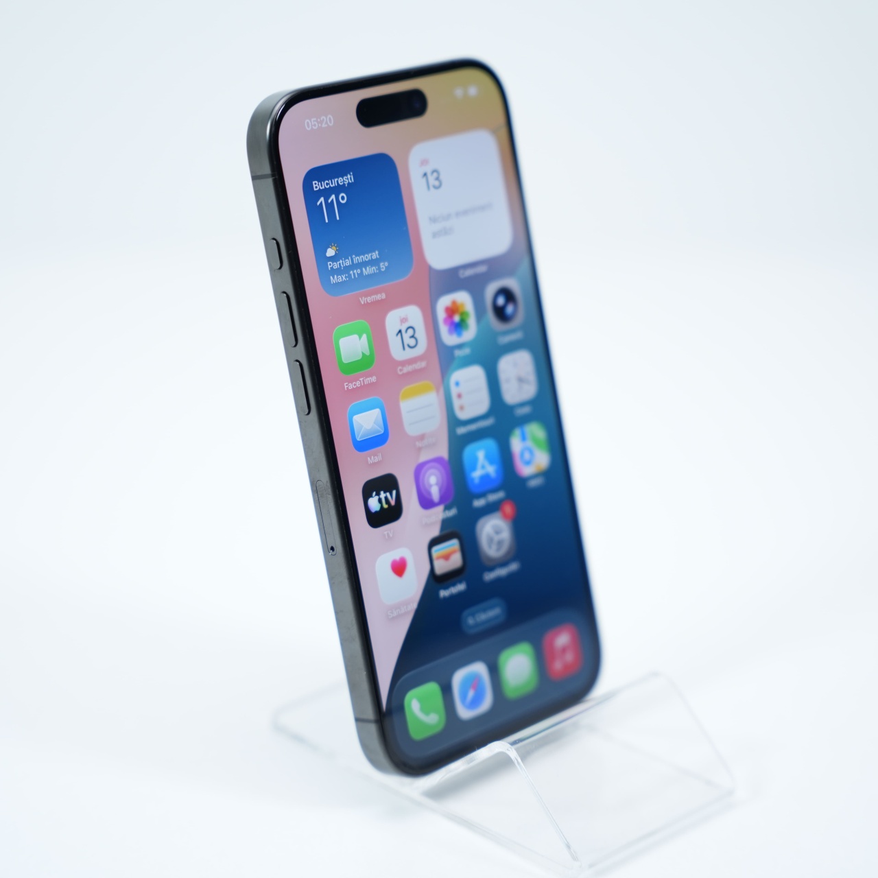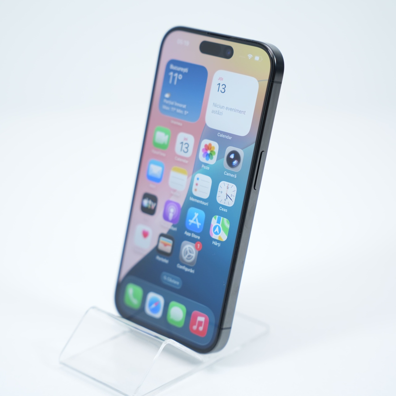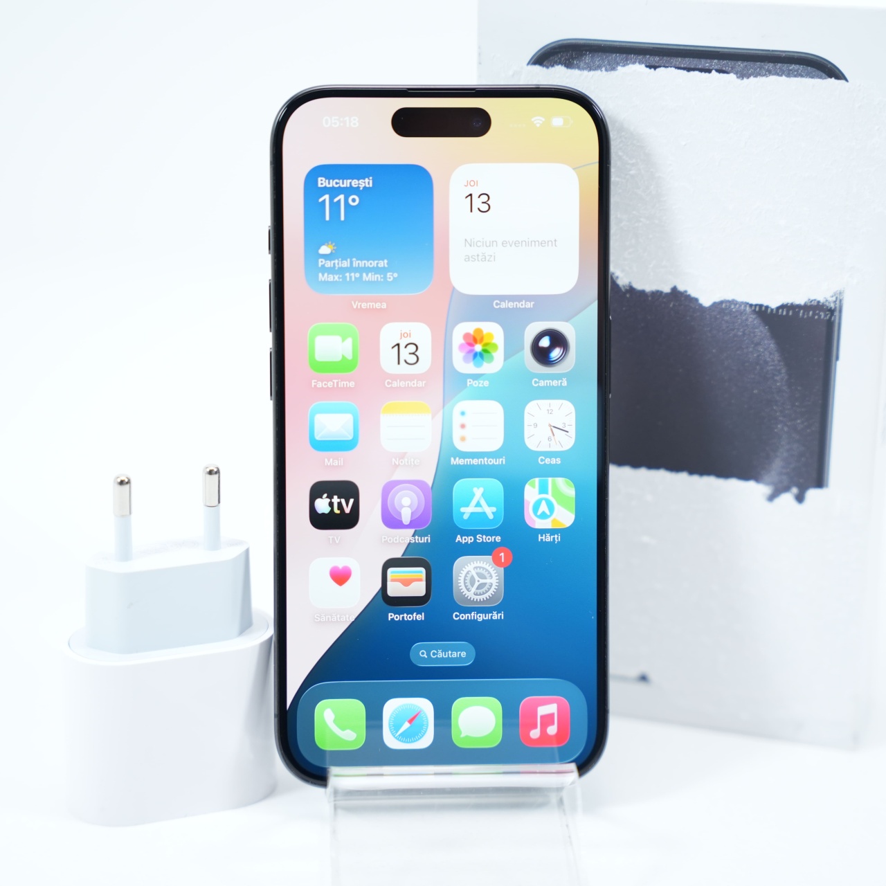 Ecran: 6.1, Refresh Rate 120 Hz Procesor: Apple A17 Pro Memorie RAM: 8GB Memorie interna: 128GB Camera Foto: Principala 48 MPx, Frontala 12 MPx Stare retea: Liber de rețea