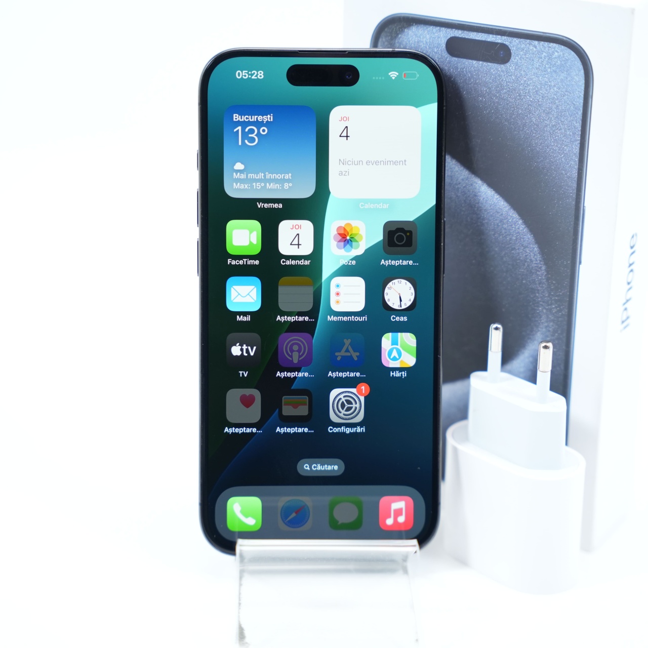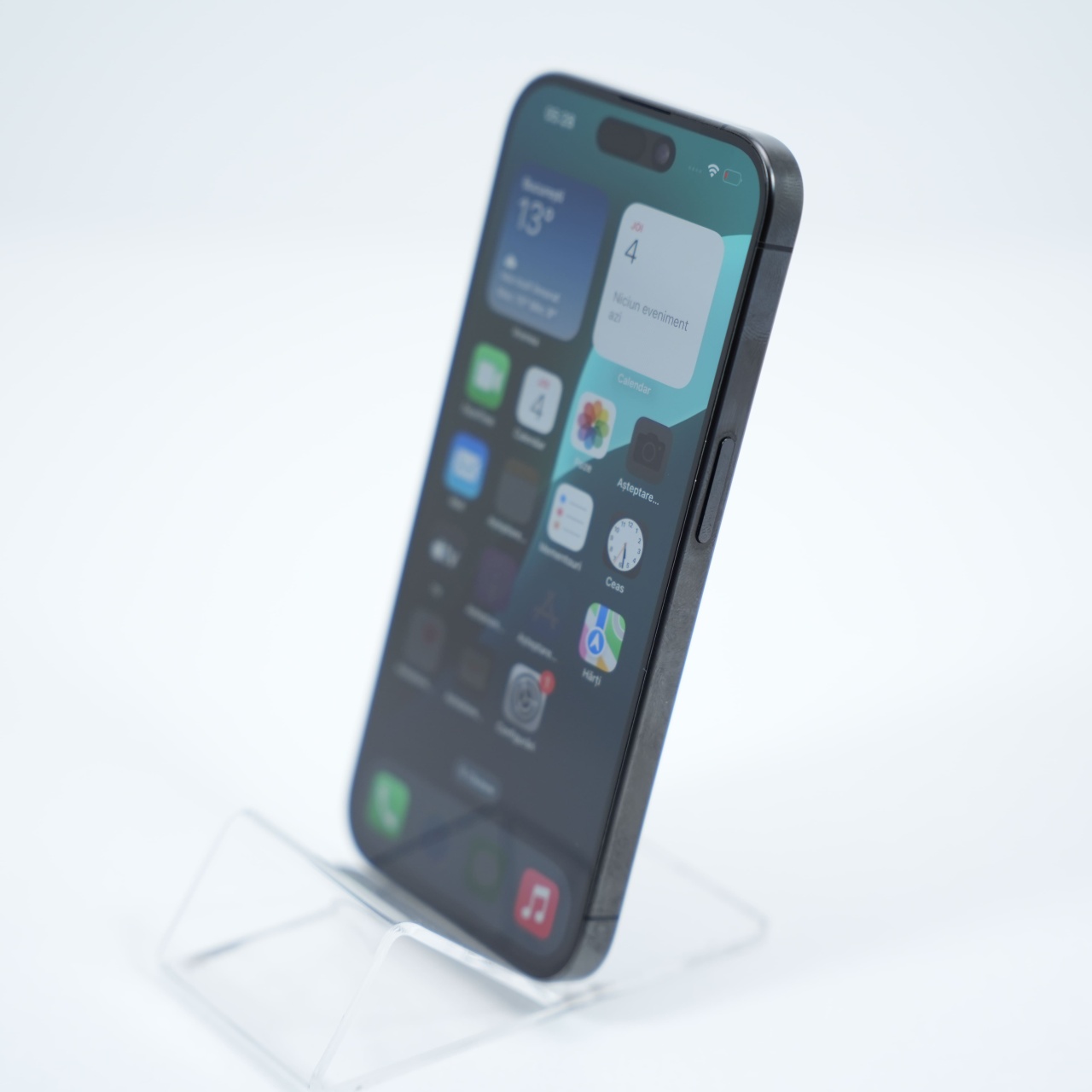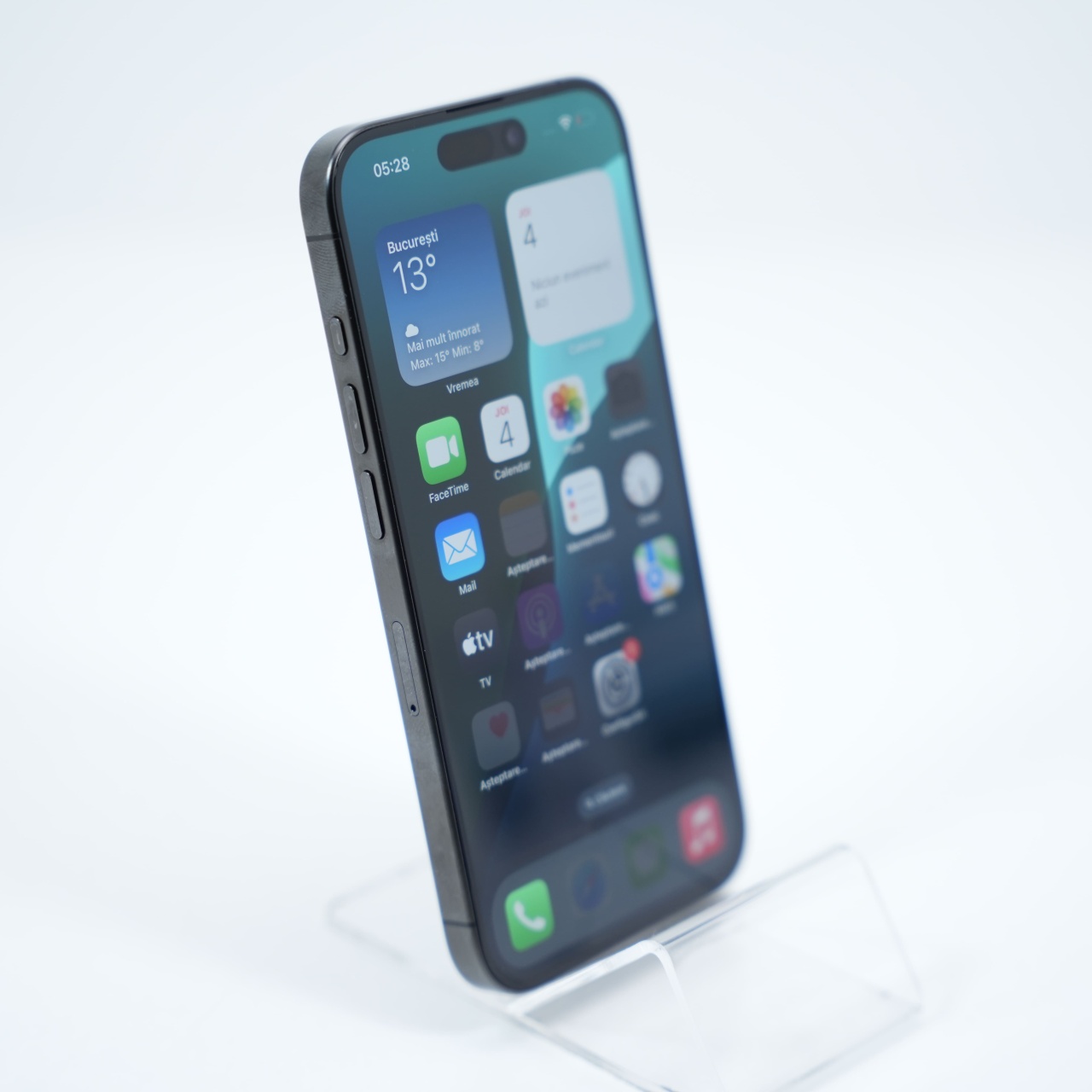 Ecran: 6.1, Refresh Rate 120 Hz Procesor: Apple A17 Pro Memorie RAM: 8 GB Memorie interna: 128GB Camera Foto: Principala 48 MPx, Frontala 12 MPx Stare retea: Liber de rețea