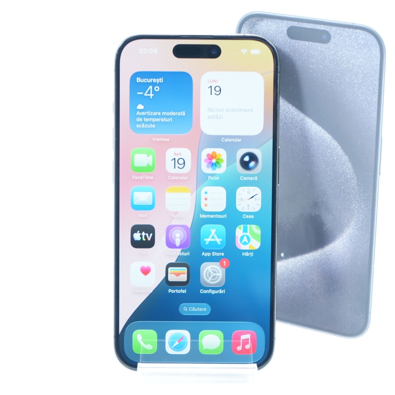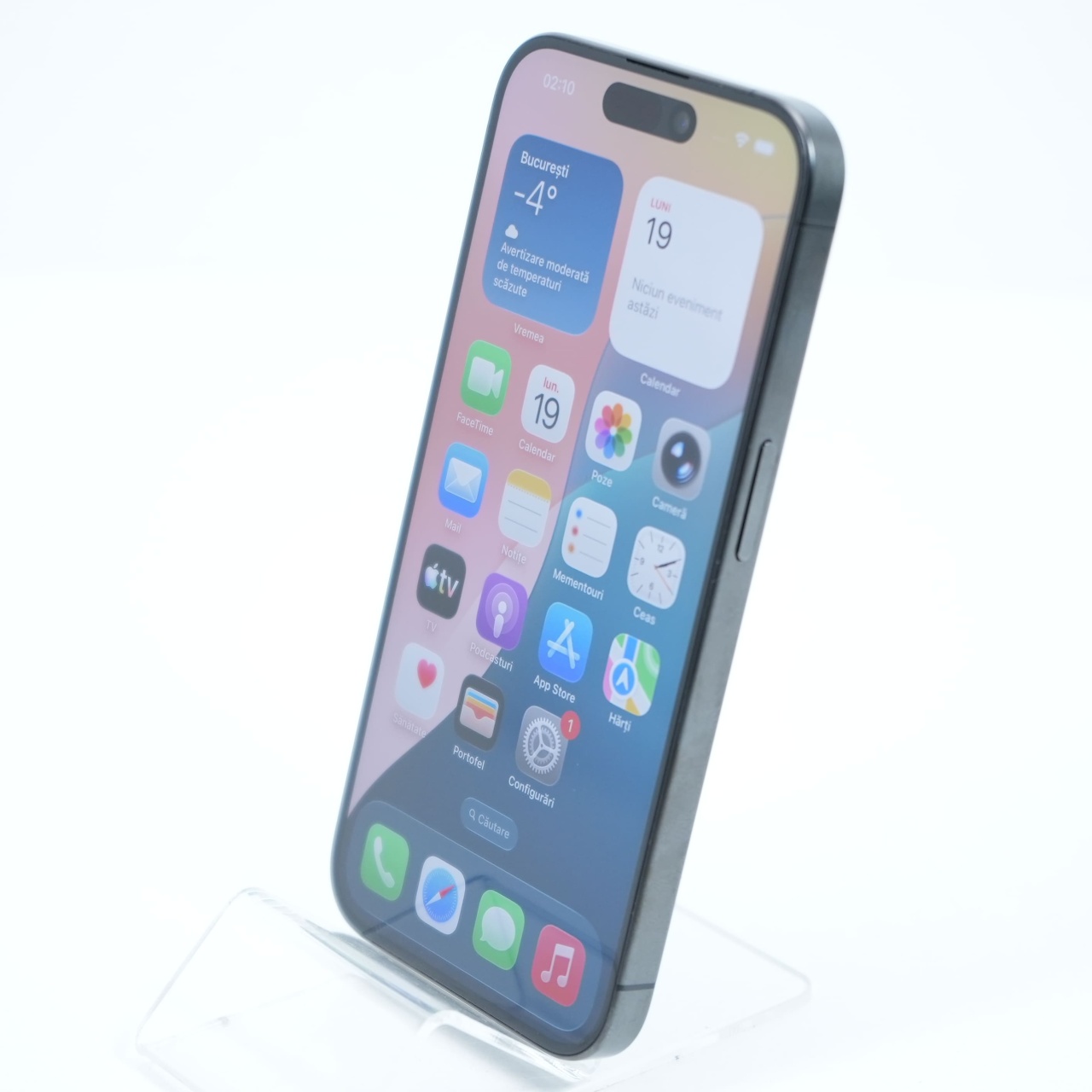 Ecran: 6.1, Refresh Rate 120 Hz Procesor: Apple A17 Pro Memorie RAM: 8 GB Memorie interna: 128GB Camera Foto: Principala 48 MPx, Frontala 12 MPx Stare retea: Liber de rețea