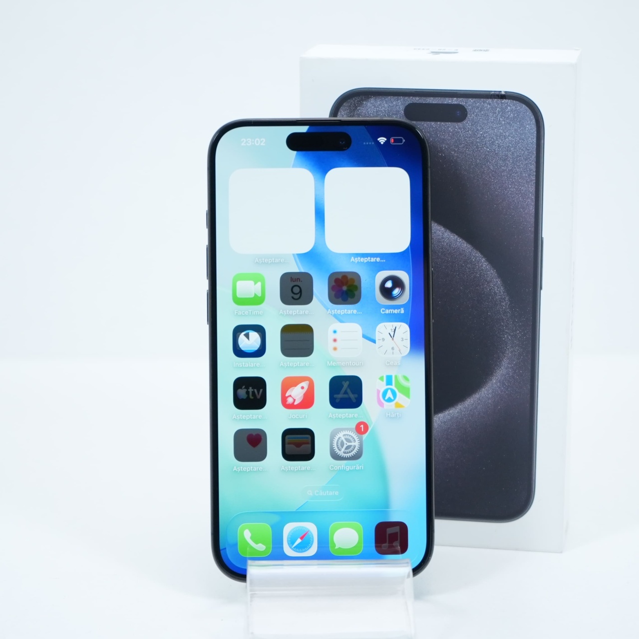 Ecran: 6.1, Refresh Rate 120 Hz Procesor: Apple A17 Pro Memorie RAM: 8GB Memorie interna: 128GB Camera Foto: Principala 48 MPx, Frontala 12 MPx Stare retea: Liber de rețea