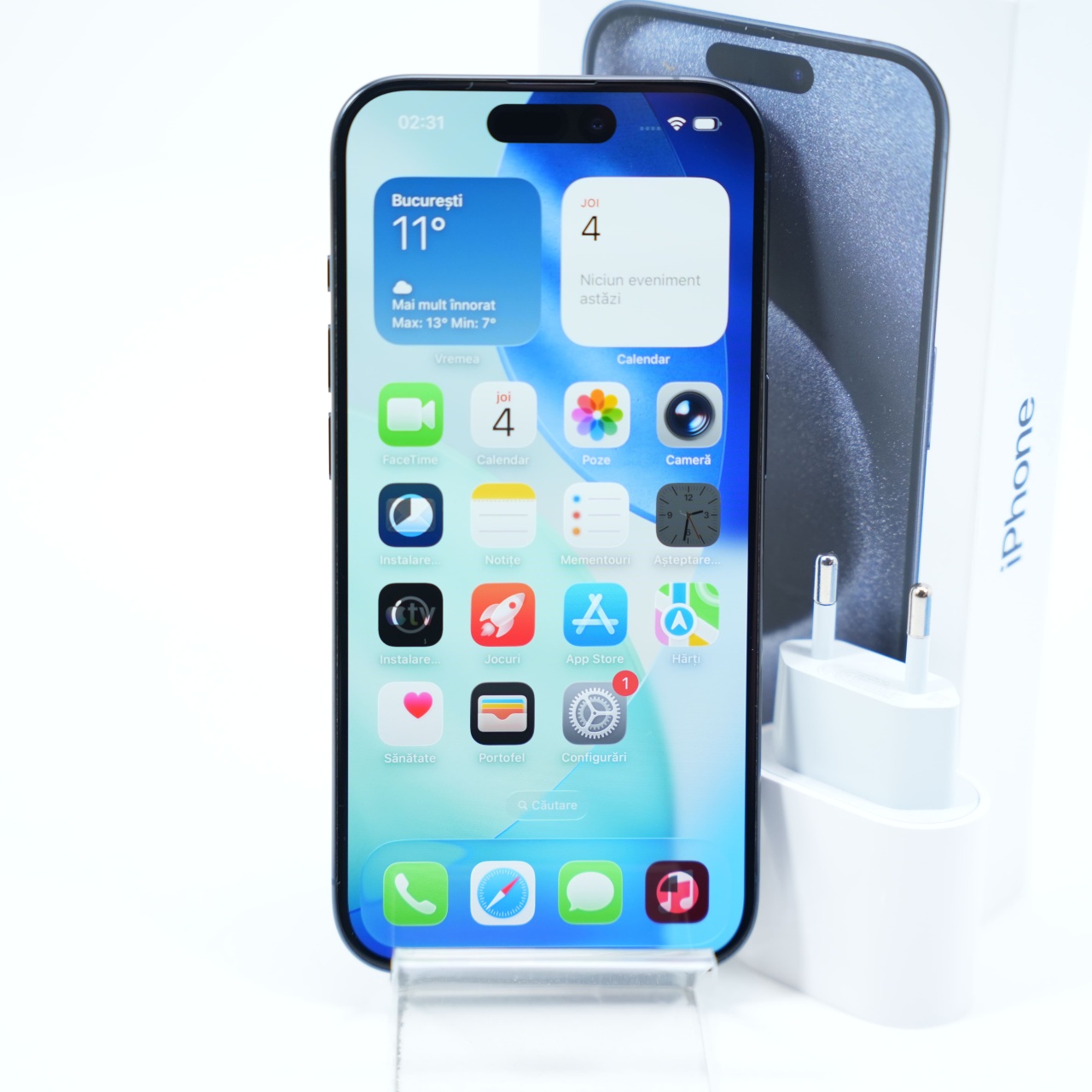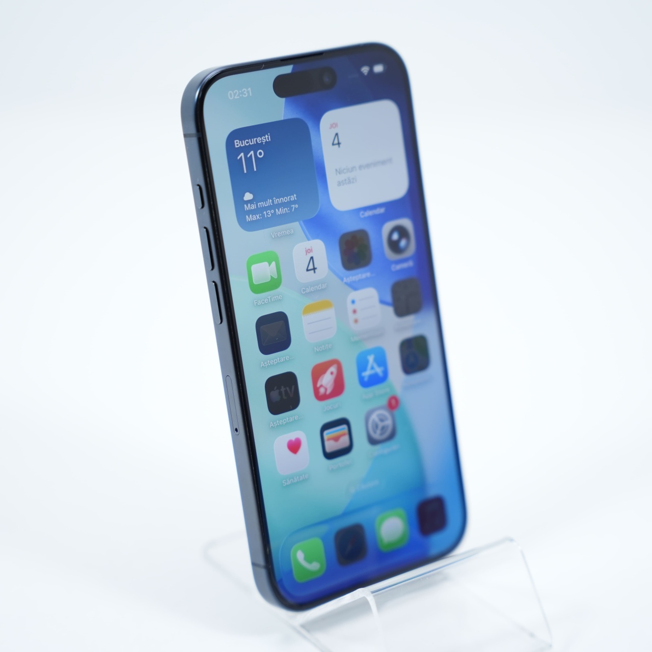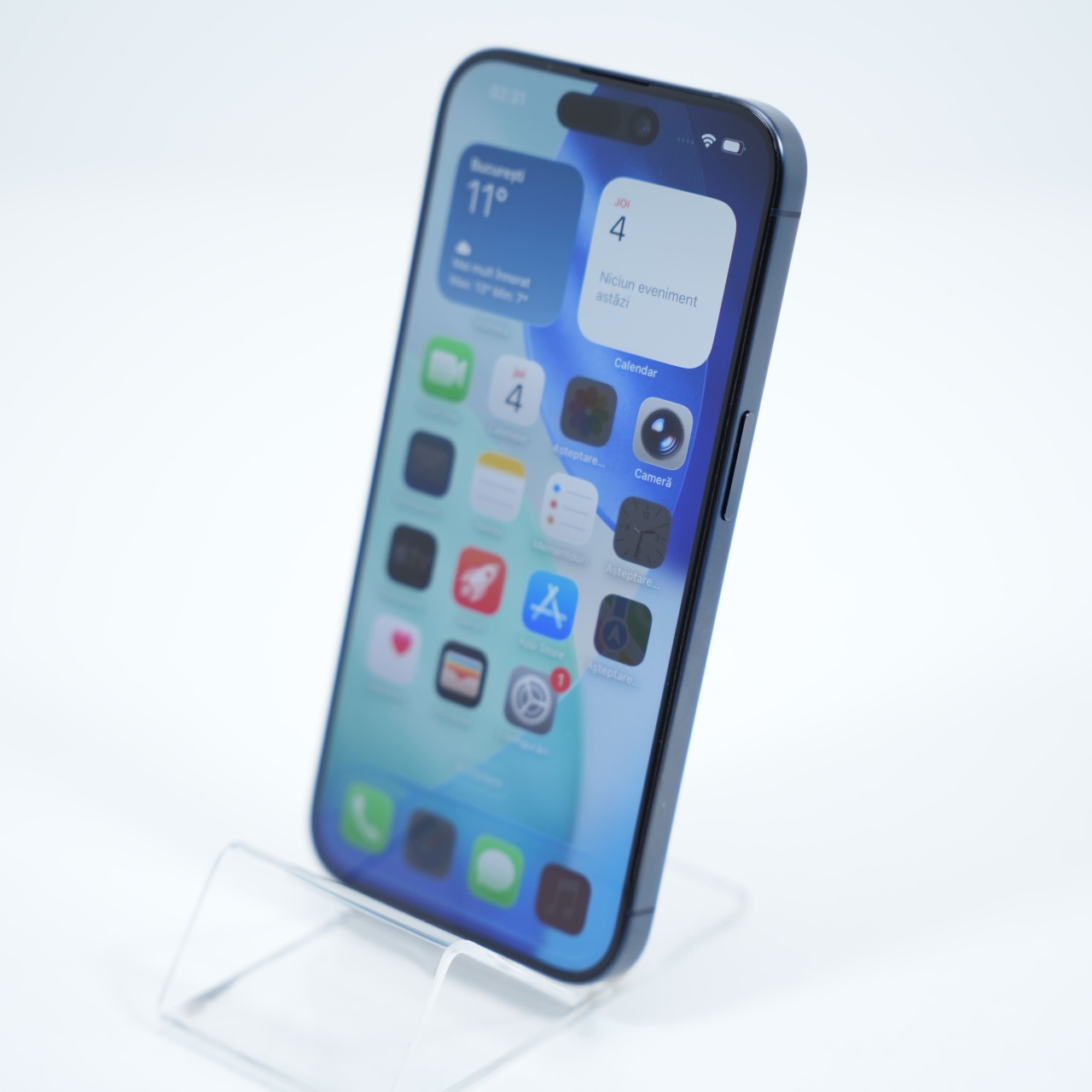 Ecran: 6.1, Refresh Rate 120 Hz Procesor: Apple A17 Pro Memorie RAM: 8 GB Memorie interna: 128GB Camera Foto: Principala 48 MPx, Frontala 12 MPx Stare retea: Liber de rețea