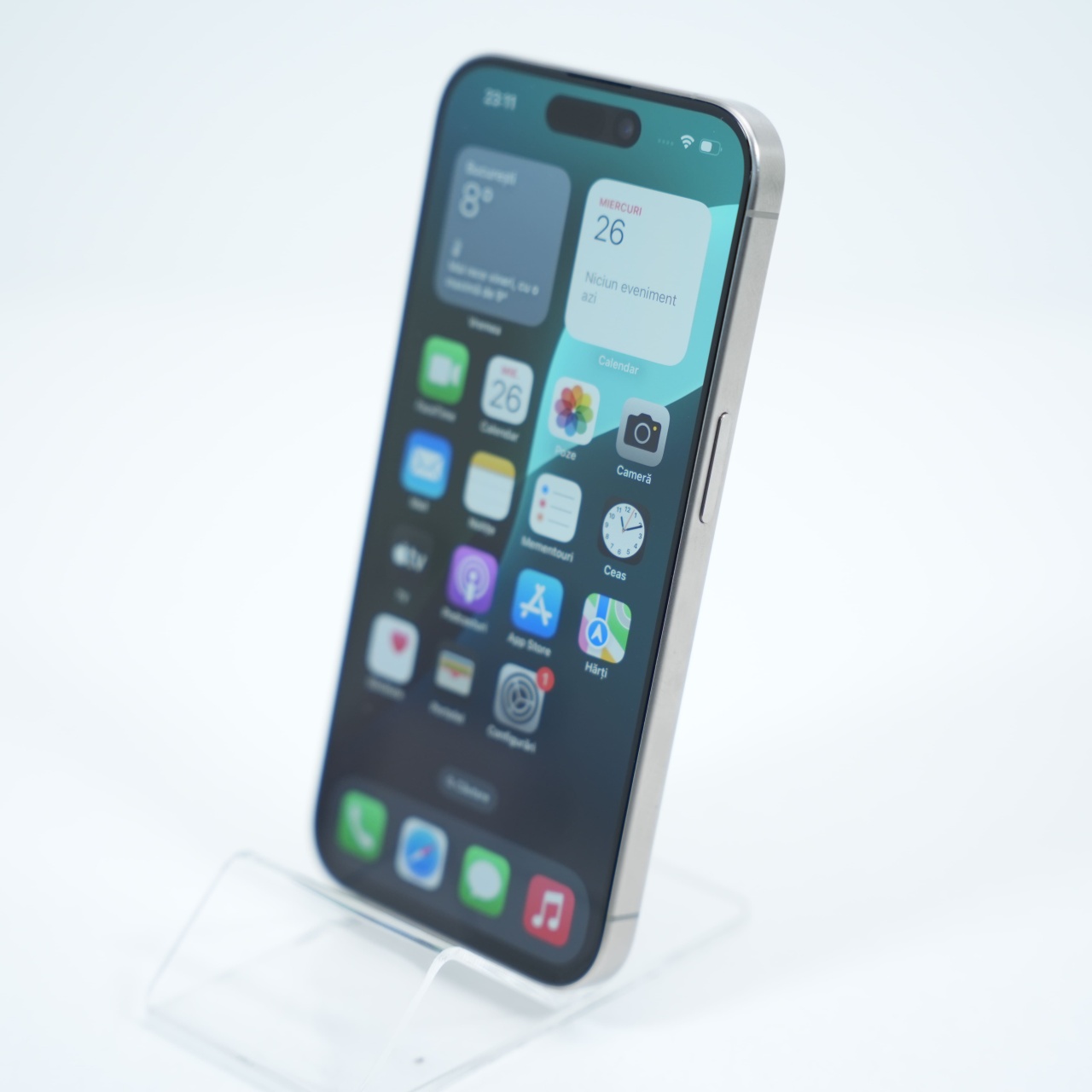 Ecran: 6.1, Refresh Rate 120 Hz Procesor: Apple A17 Pro Memorie RAM: 8GB Memorie interna: 128GB Camera Foto: Principala 48 MPx, Frontala 12 MPx Stare retea: Liber de rețea