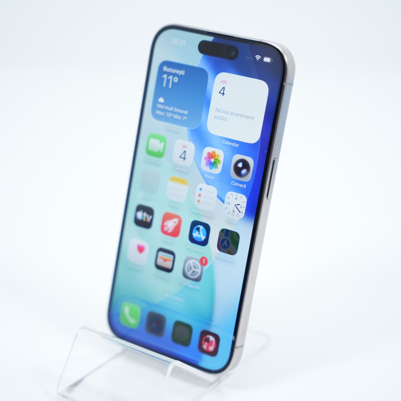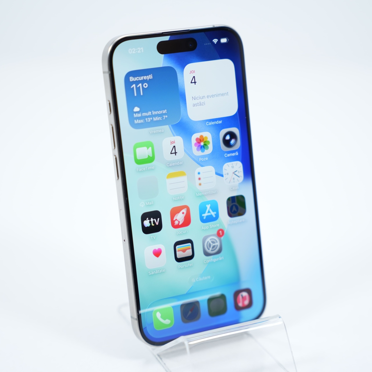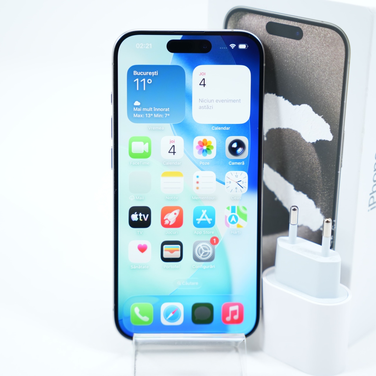 Ecran: 6.1, Refresh Rate 120 Hz Procesor: Apple A17 Pro Memorie RAM: 8 GB Memorie interna: 128GB Camera Foto: Principala 48 MPx, Frontala 12 MPx Stare retea: Liber de rețea