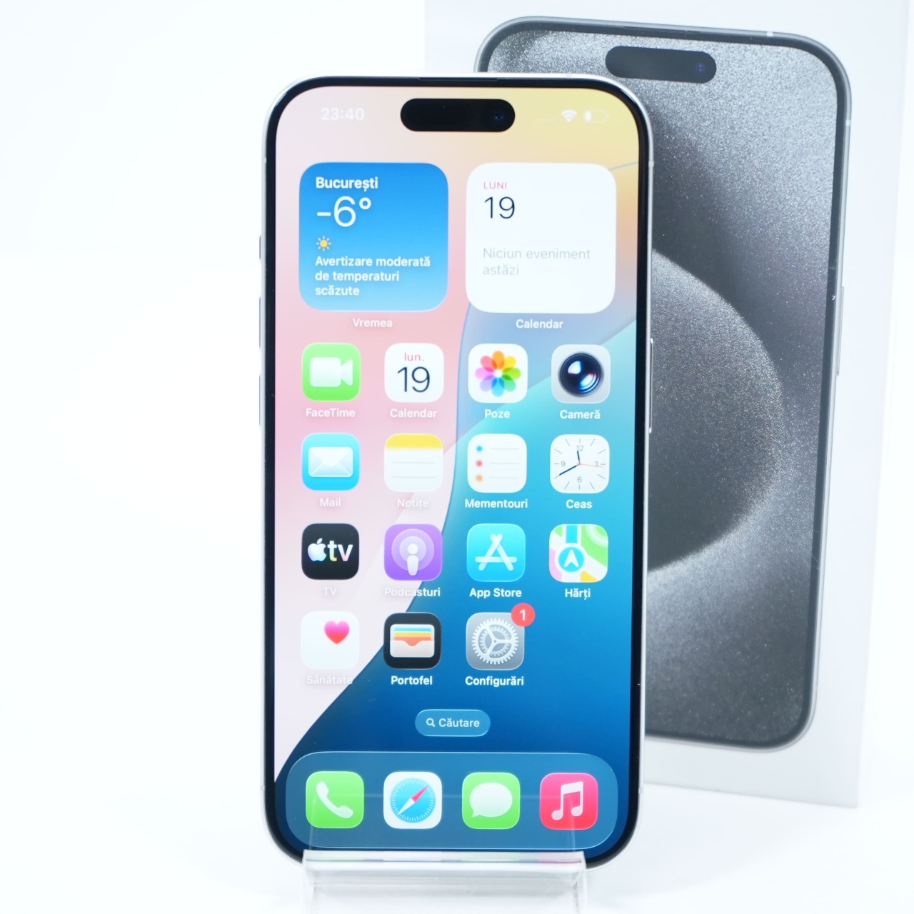 Ecran: 6.1, Refresh Rate 120 Hz Procesor: Apple A17 Pro Memorie RAM: 8 GB Memorie interna: 128GB Camera Foto: Principala 48 MPx, Frontala 12 MPx Stare retea: Liber de rețea