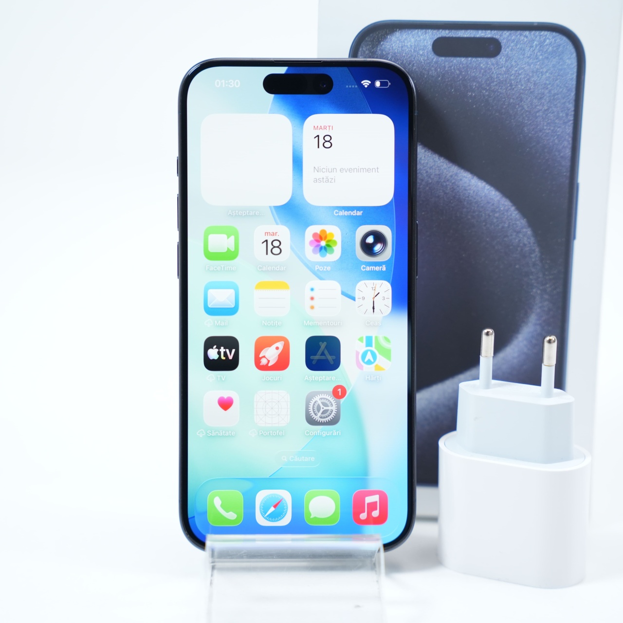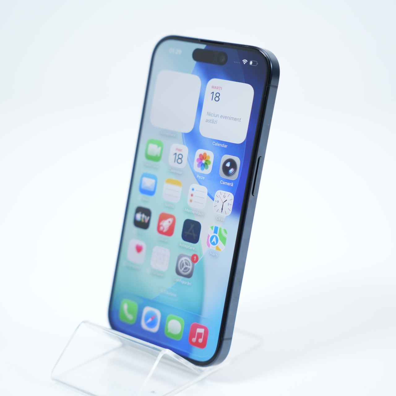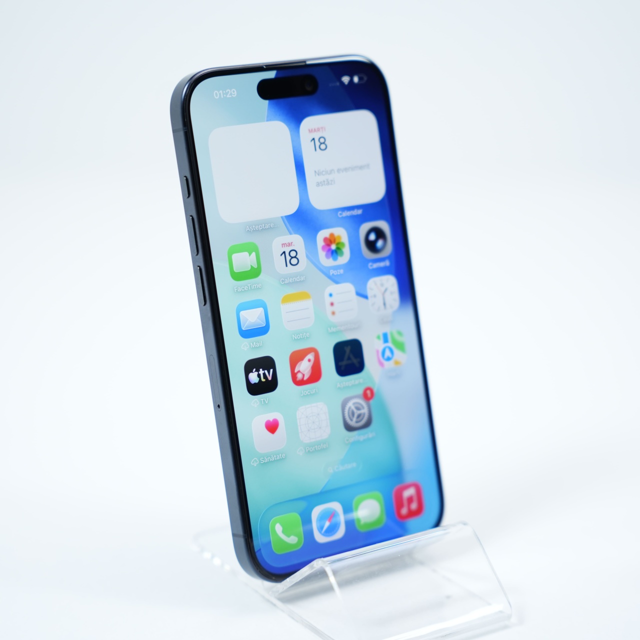 Ecran: 6.1, Refresh Rate 120 Hz Procesor: Apple A17 Pro Memorie RAM: 8GB Memorie interna: 256GB Camera Foto: Principala 48 MPx, Frontala 12 MPx Stare retea: Liber de rețea