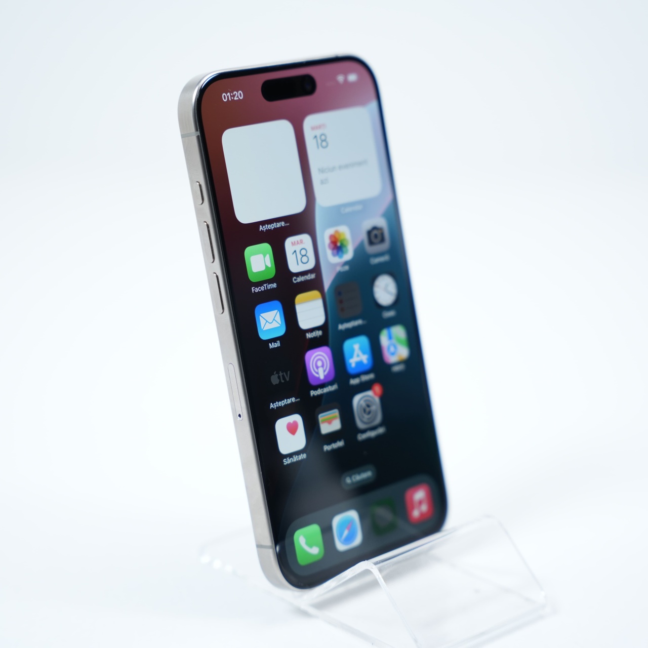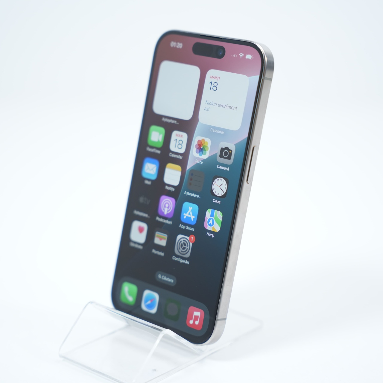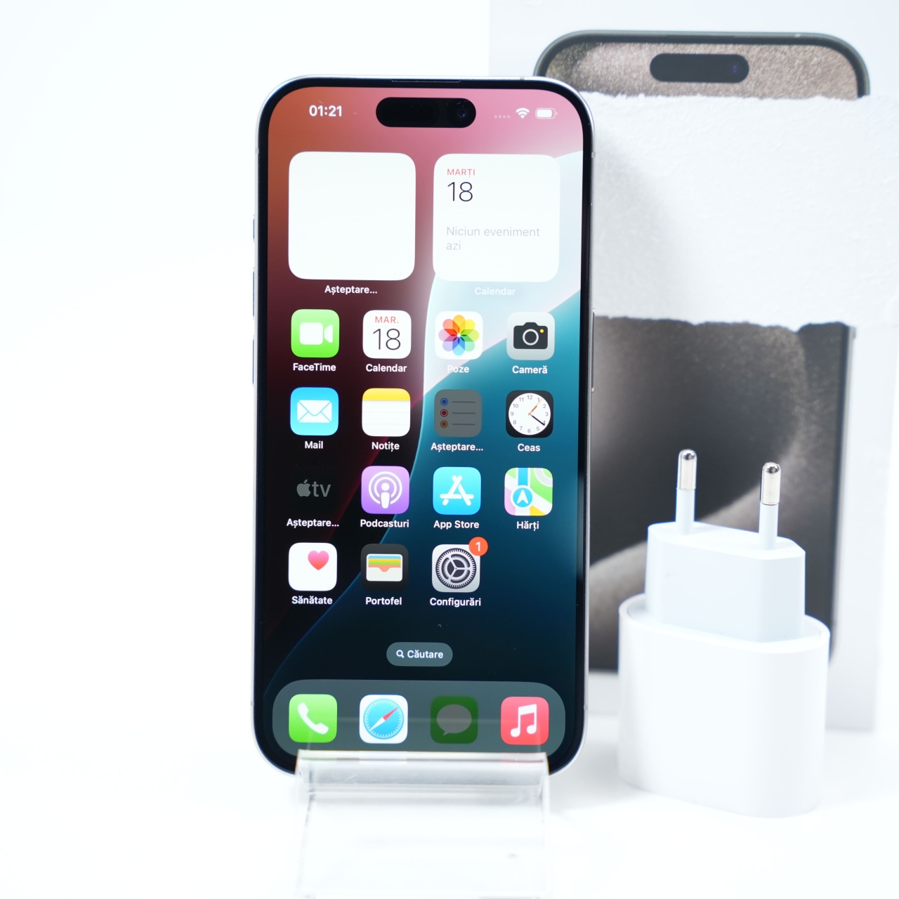 Ecran: 6.1, Refresh Rate 120 Hz Procesor: Apple A17 Pro Memorie RAM: 8GB Memorie interna: 256GB Camera Foto: Principala 48 MPx, Frontala 12 MPx Stare retea: Liber de rețea