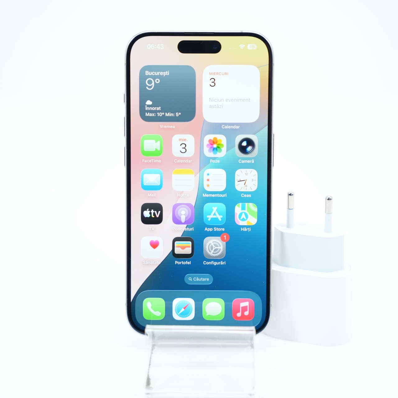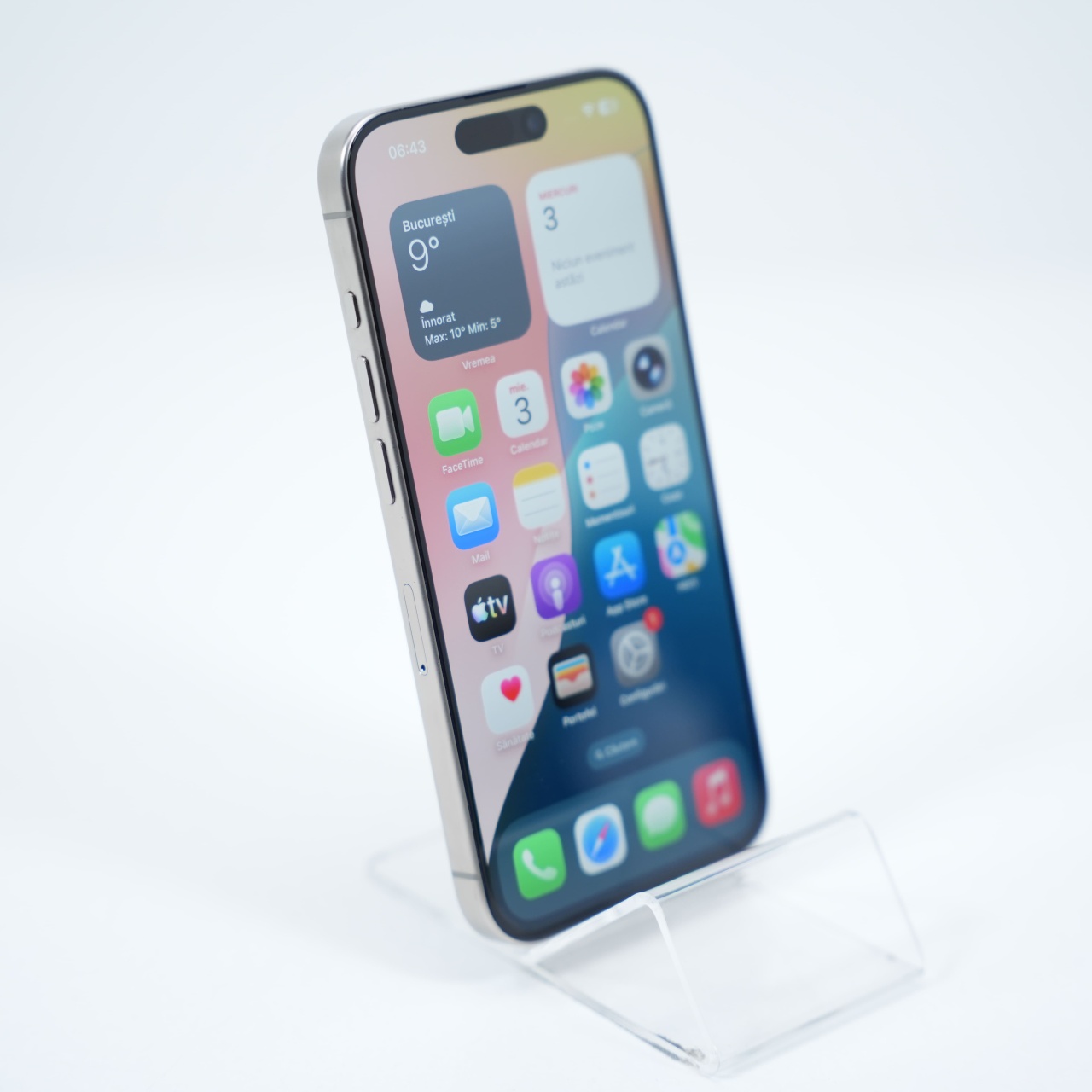 Ecran: 6.1, Refresh Rate 120 Hz Procesor: Apple A17 Pro Memorie RAM: 8GB Memorie interna: 256GB Camera Foto: Principala 48 MPx, Frontala 12 MPx Stare retea: Liber de rețea