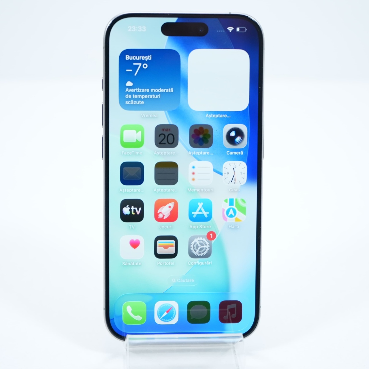 Ecran: 6.1, Refresh Rate 120 Hz Procesor: Apple A17 Pro Memorie RAM: 8GB Memorie interna: 256GB Camera Foto: Principala 48 MPx, Frontala 12 MPx Stare retea: Liber de rețea