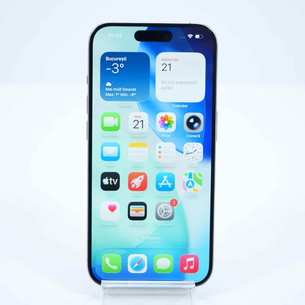 Ecran: 6.1, Refresh Rate 120 Hz Procesor: Apple A17 Pro Memorie RAM: 8GB Memorie interna: 256GB Camera Foto: Principala 48 MPx, Frontala 12 MPx Stare retea: Liber de rețea