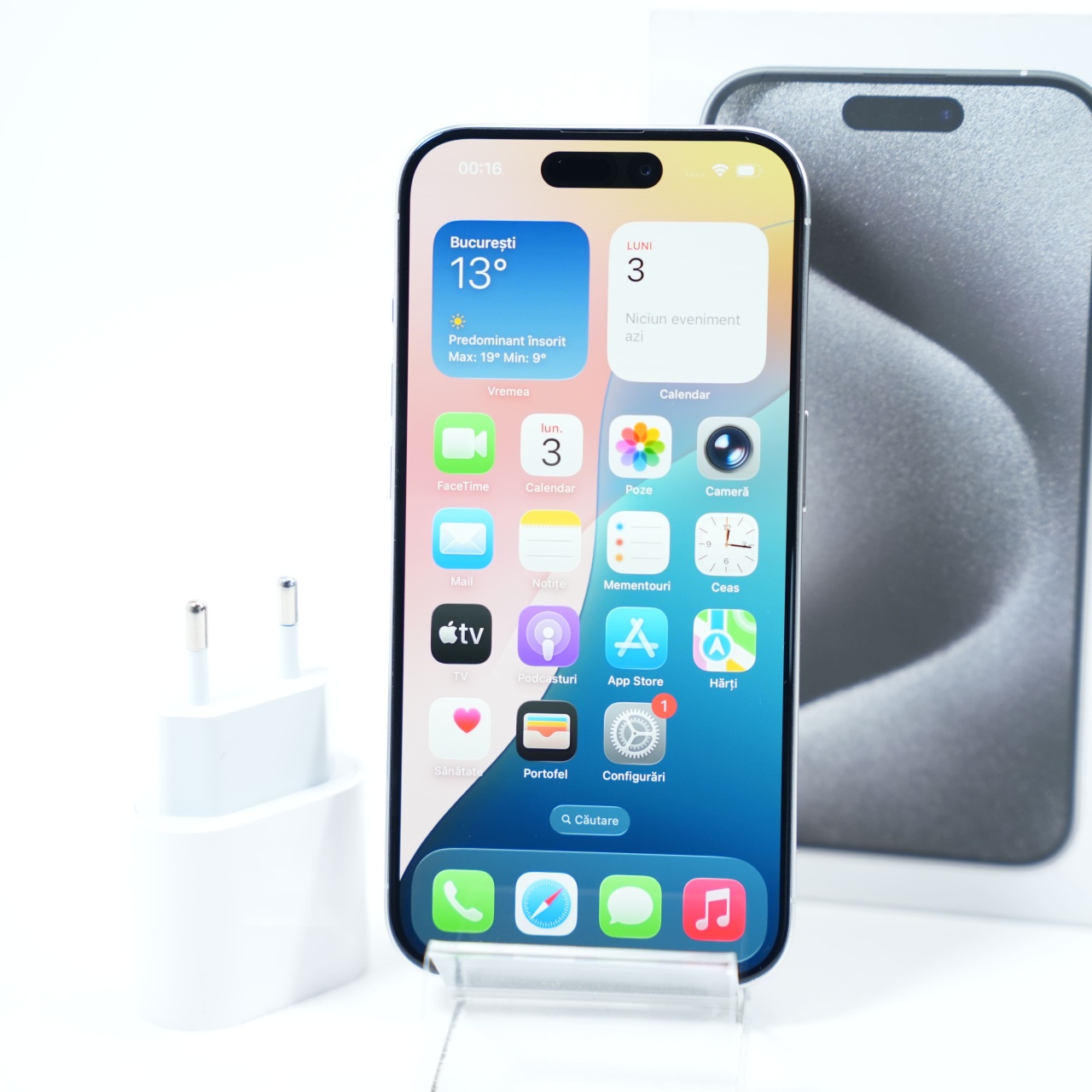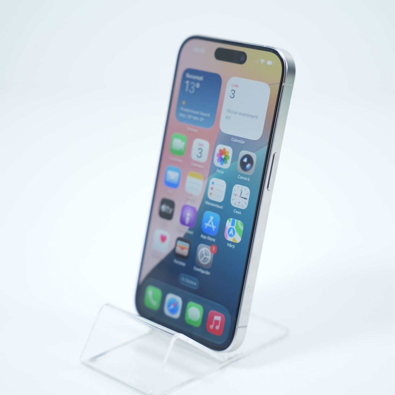 Ecran: 6.1, Refresh Rate 120 Hz Procesor: Apple A17 Pro Memorie RAM: 8GB Memorie interna: 256GB Camera Foto: Principala 48 MPx, Frontala 12 MPx Stare retea: Liber de rețea