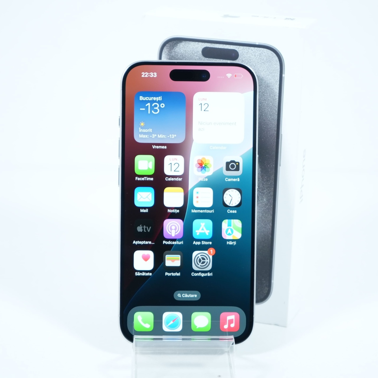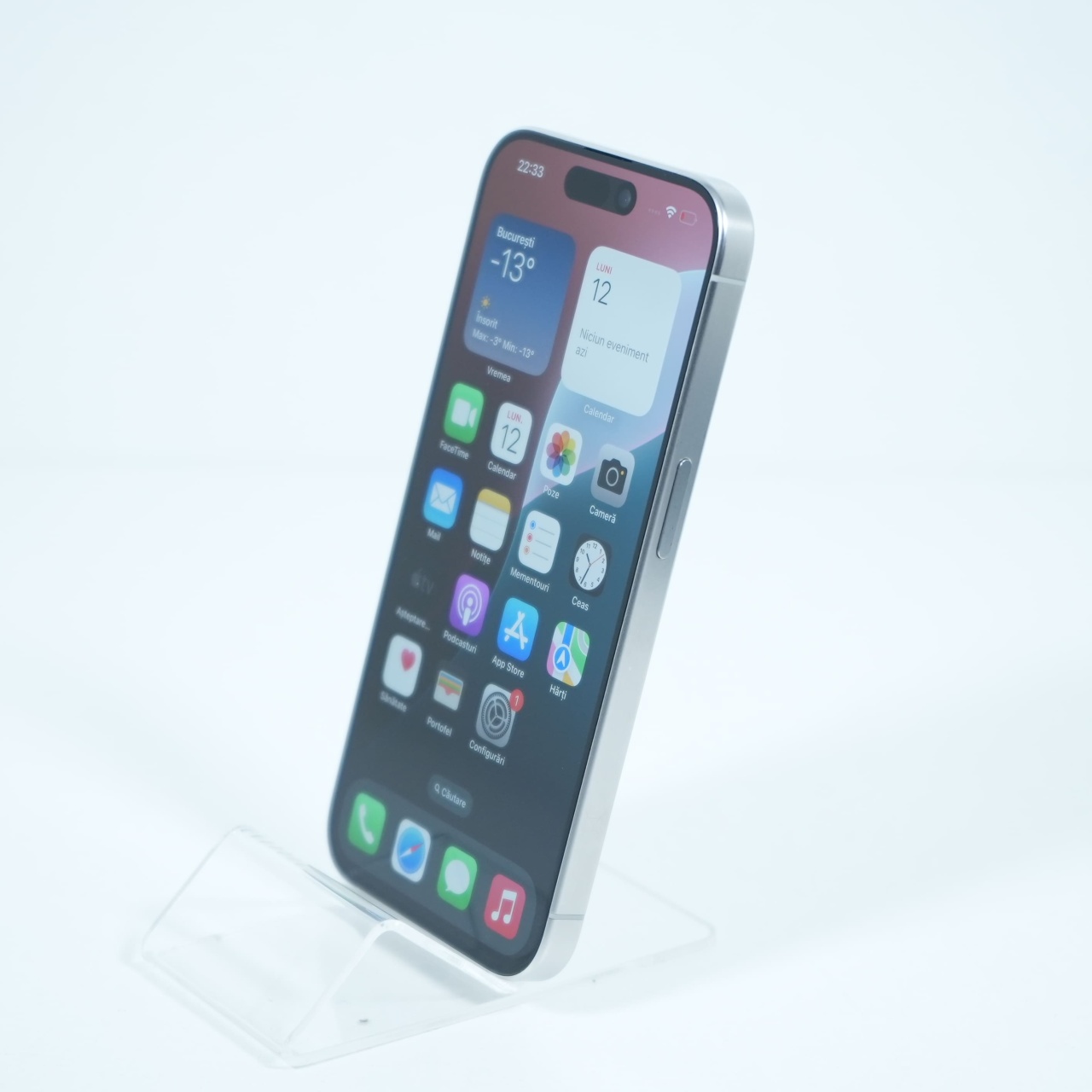 Ecran: 6.1, Refresh Rate 120 Hz Procesor: Apple A17 Pro Memorie RAM: 8GB Memorie interna: 256GB Camera Foto: Principala 48 MPx, Frontala 12 MPx Stare retea: Liber de rețea