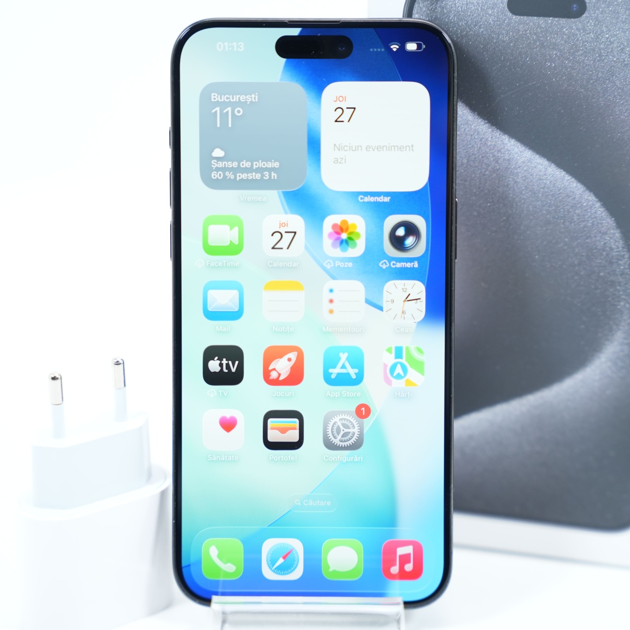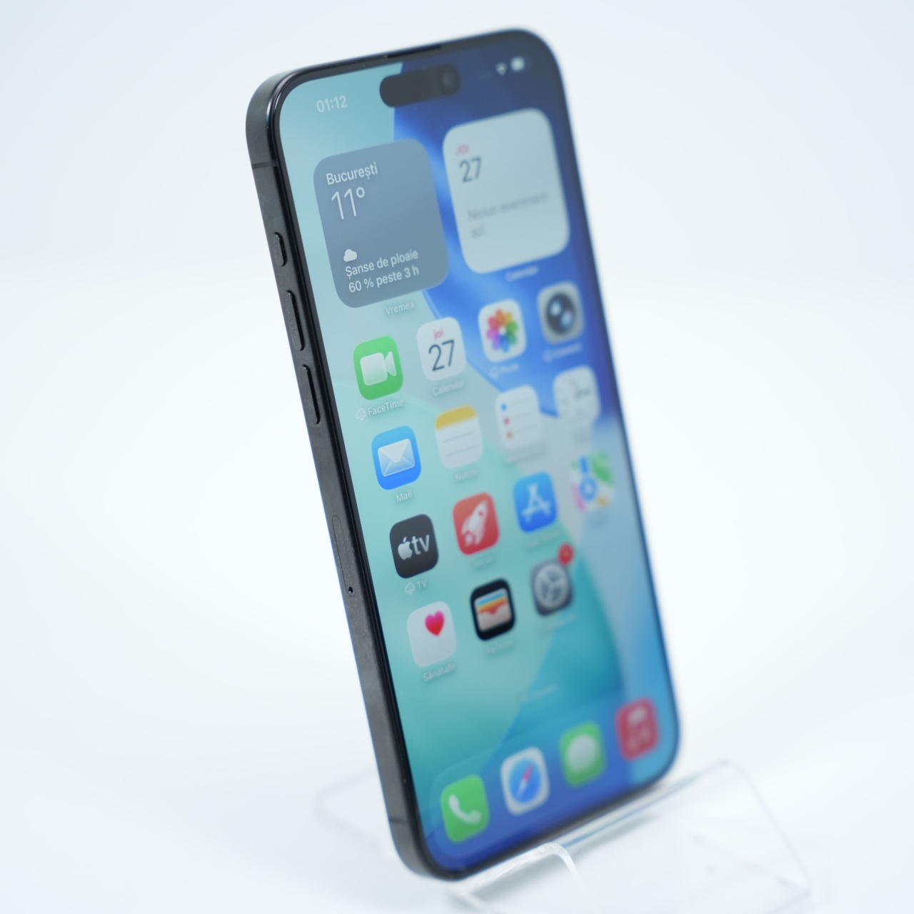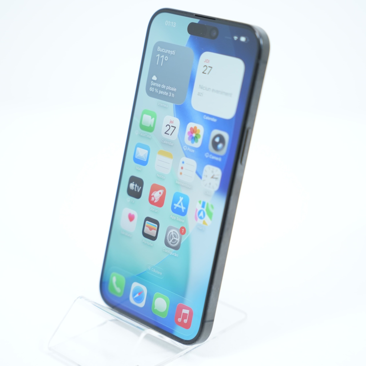 Ecran: 6.7, Refresh Rate 120 Hz Procesor: Apple A17 Pro Memorie RAM: 8 GB Memorie interna: 256GB Camera foto: Principala 48 MPx, Frontala 12 MPx Stare retea: Liber de rețea