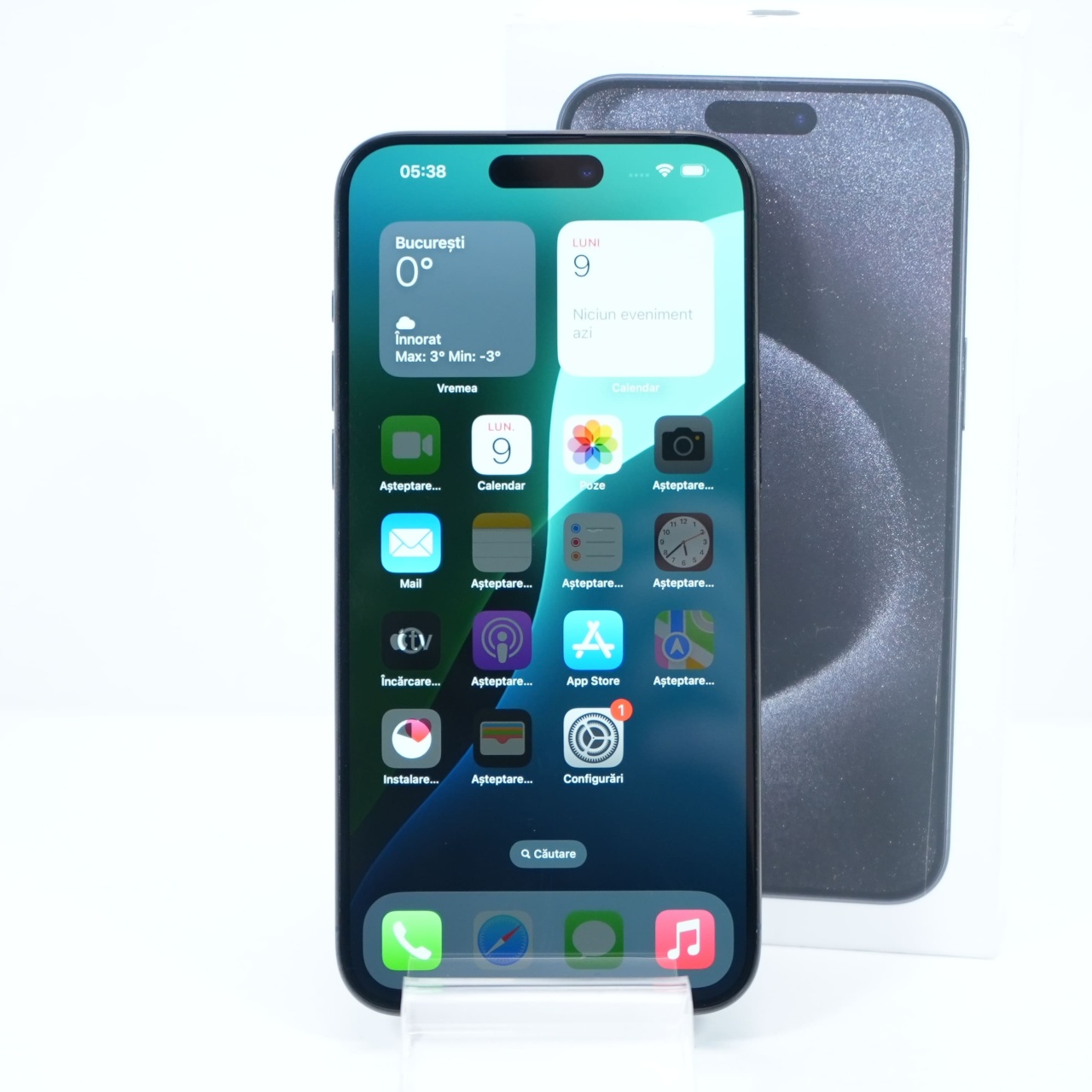 Ecran: 6.7, Refresh Rate 120 Hz Procesor: Apple A17 Pro Memorie RAM: 8 GB Memorie interna: 256GB Camera foto: Principala 48 MPx, Frontala 12 MPx Stare retea: Liber de rețea