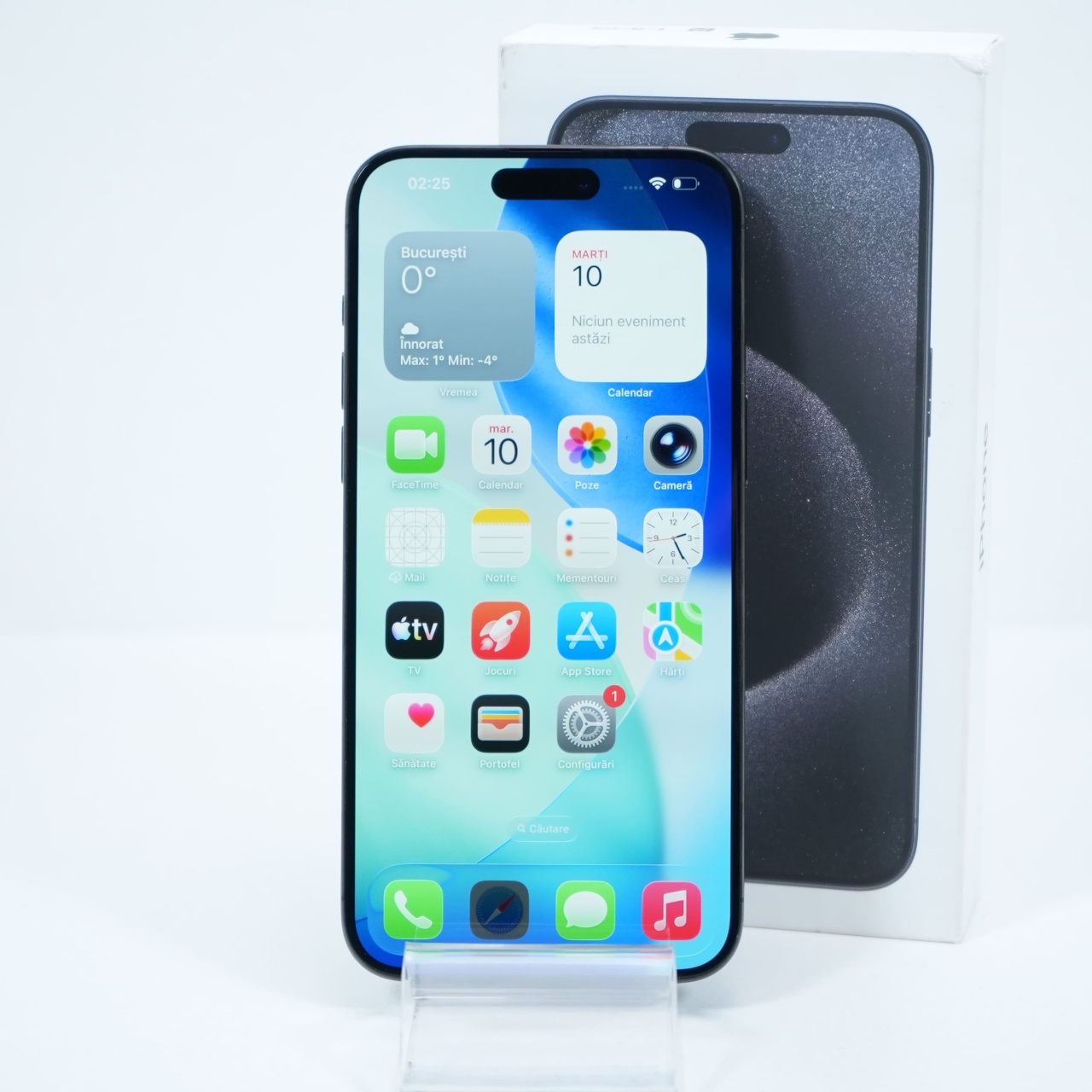 Ecran: 6.7, Refresh Rate 120 Hz Procesor: Apple A17 Pro Memorie RAM: 8 GB Memorie interna: 256GB Camera foto: Principala 48 MPx, Frontala 12 MPx Stare retea: Liber de rețea
