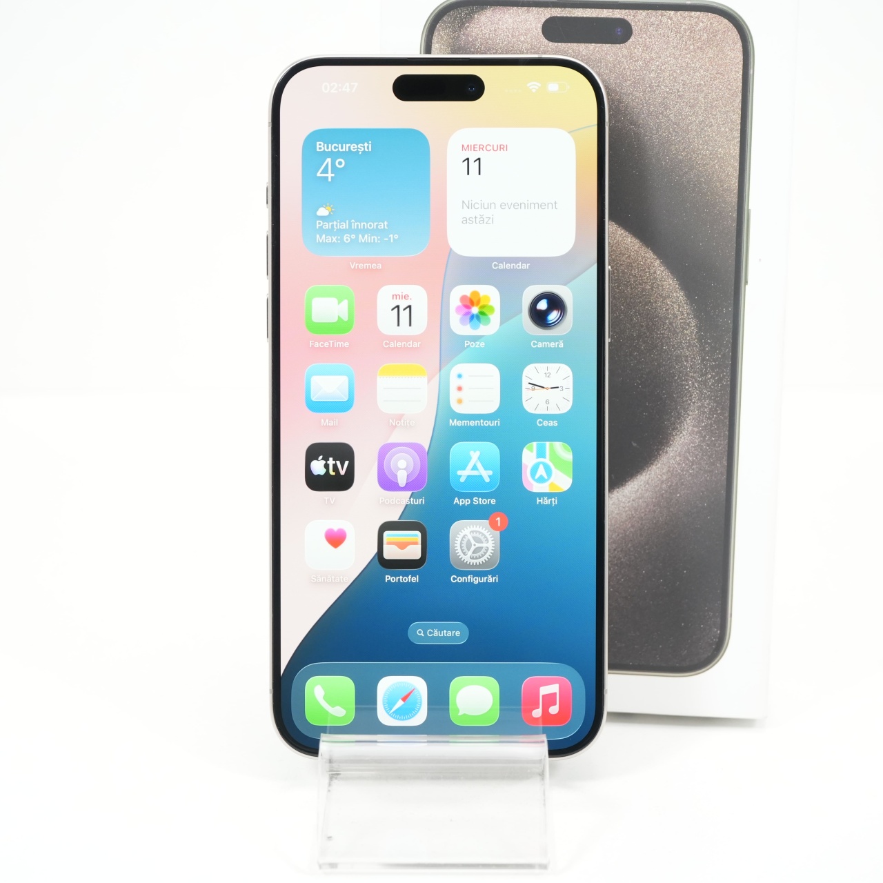 Ecran: 6.7, Refresh Rate 120 Hz Procesor: Apple A17 Pro Memorie RAM: 8 GB Memorie interna: 256GB Camera foto: Principala 48 MPx, Frontala 12 MPx Stare retea: Liber de rețea