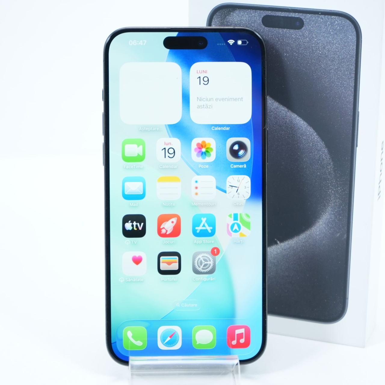 Ecran: 6.7, Refresh Rate 120 Hz Procesor: Apple A17 Pro Memorie RAM: 8GB Memorie interna: 512GB Camera foto: Principala 48 MPx, Frontala 12 MPx Stare retea: Liber de rețea