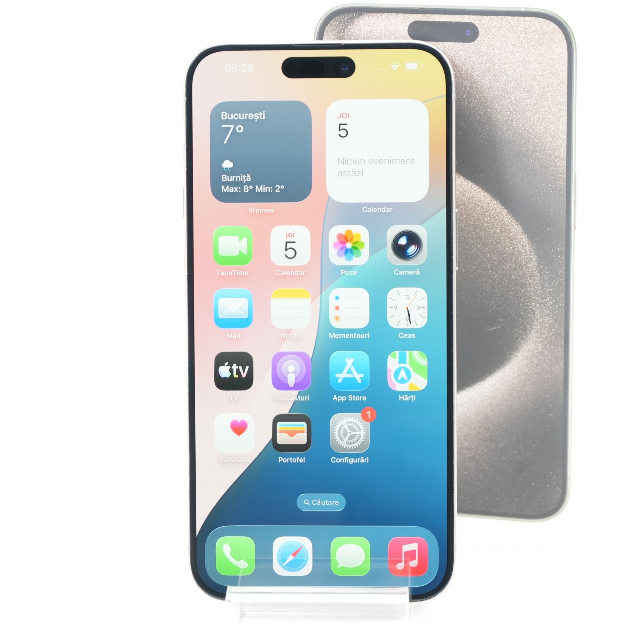 Ecran: 6.7, Refresh Rate 120 Hz Procesor: Apple A17 Pro Memorie RAM: 8 GB Memorie interna: 512GB Camera foto: Principala 48 MPx, Frontala 12 MPx Stare retea: Liber de rețea