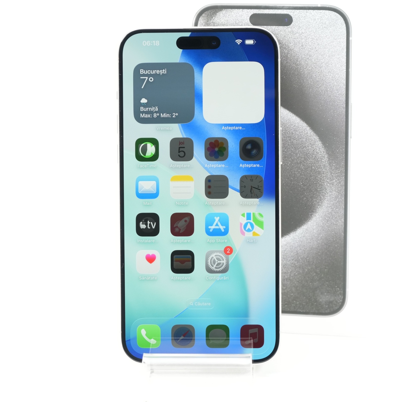 Ecran: 6.7, Refresh Rate 120 Hz Procesor: Apple A17 Pro Memorie RAM: 8 GB Memorie interna: 512GB Camera foto: Principala 48 MPx, Frontala 12 MPx Stare retea: Liber de rețea