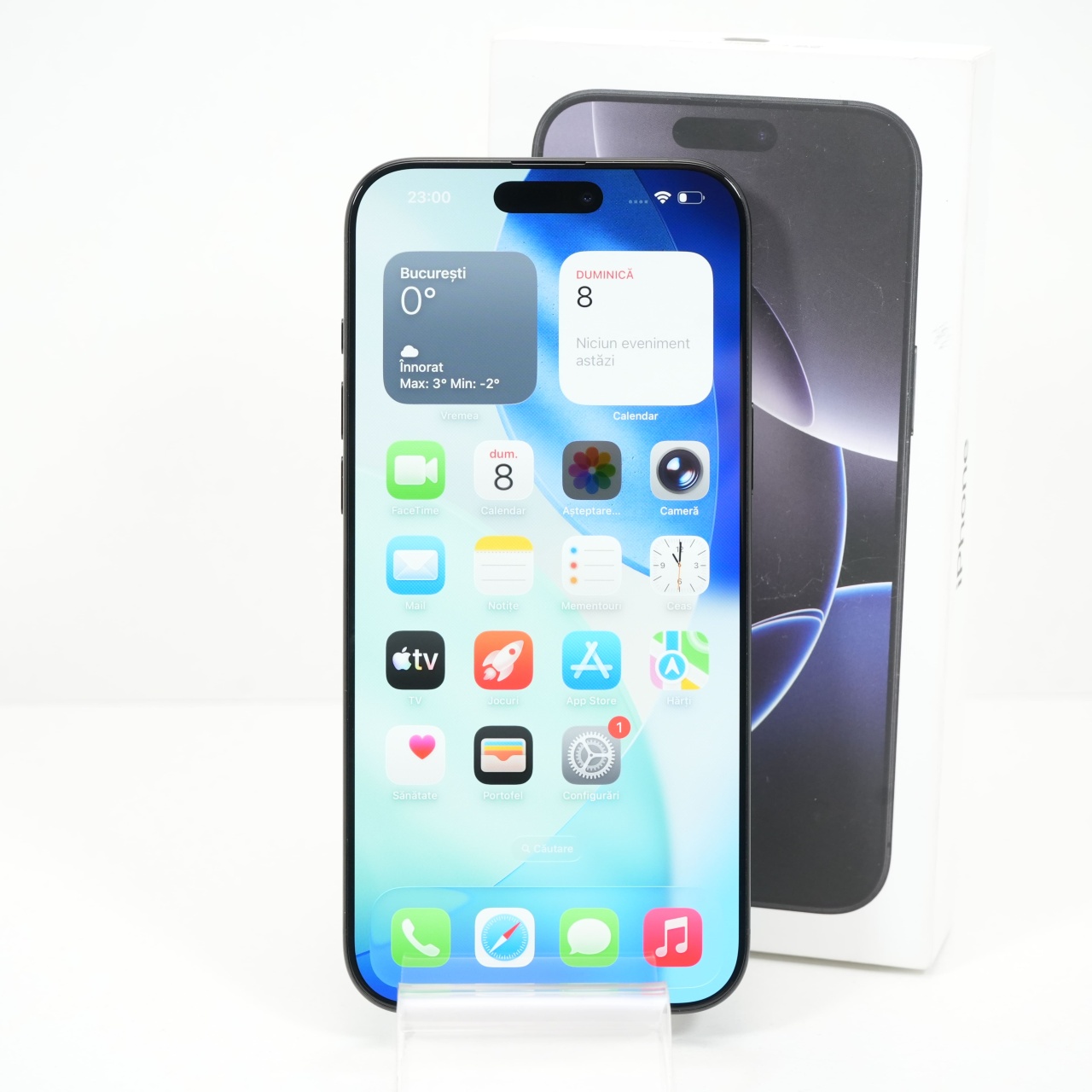 Ecran: OLED de 6.9, Refresh Rate 120 Hz Procesor: Apple A18 Pro Memorie RAM: 8 GB Memorie interna: 1TB Camera Foto: Principala 48 MPx, Frontala 12 MPx Stare retea: Liber de rețea