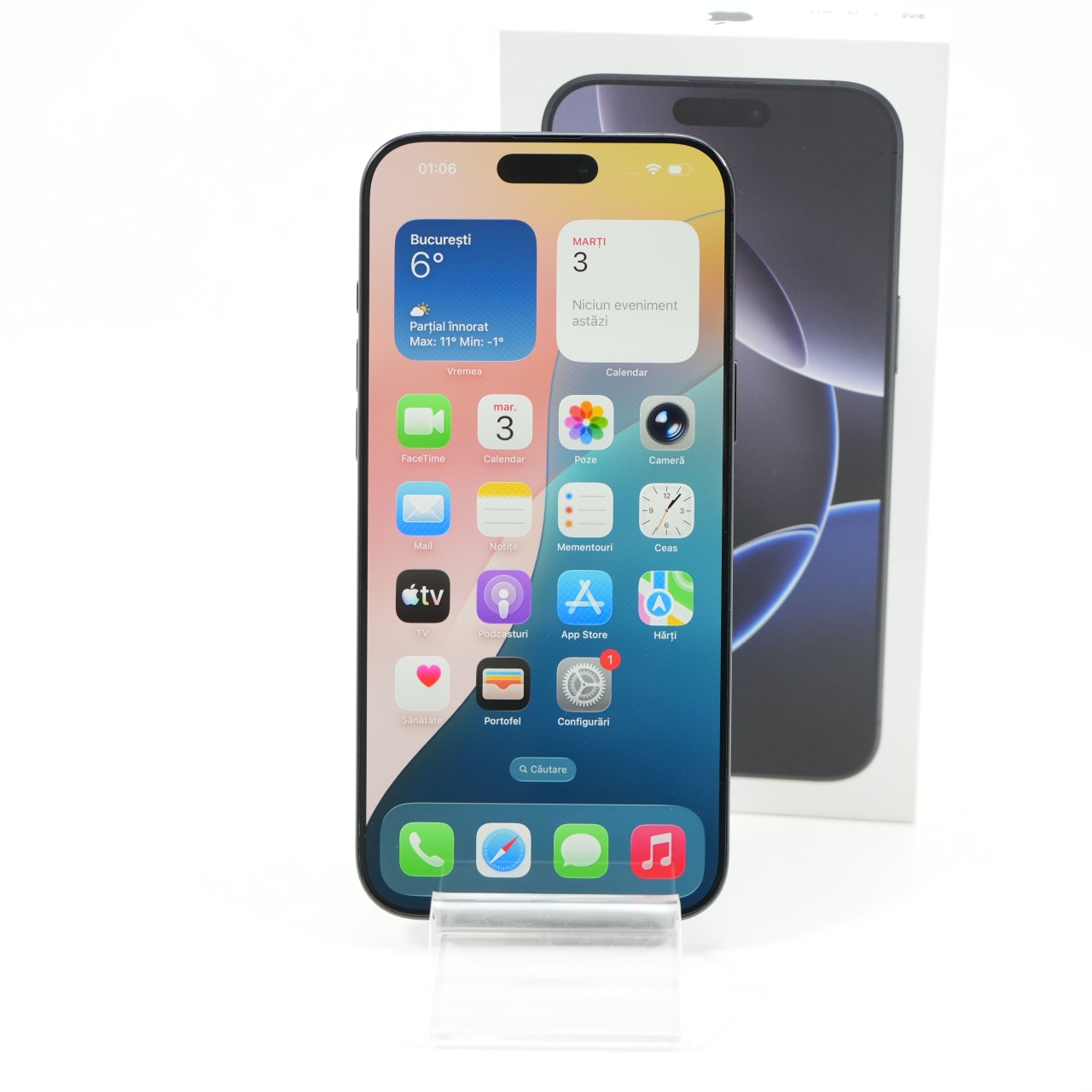 Ecran: OLED de 6.9, Refresh Rate 120 Hz Procesor: Apple A18 Pro Memorie RAM: 8 GB Memorie interna: 1TB Camera Foto: Principala 48 MPx, Frontala 12 MPx Stare retea: Liber de rețea