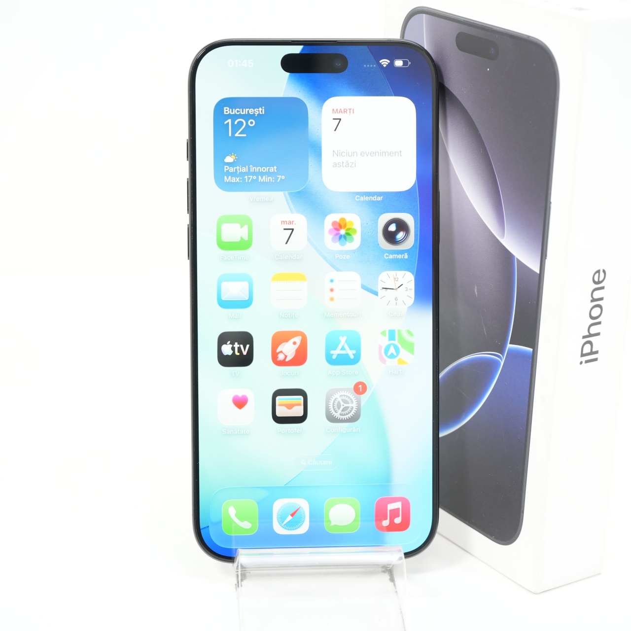 Ecran: OLED de 6.9, Refresh Rate 120 Hz Procesor: Apple A18 Pro Memorie RAM: 8 GB Memorie interna: 1TB Camera Foto: Principala 48 MPx, Frontala 12 MPx Stare retea: Liber de rețea