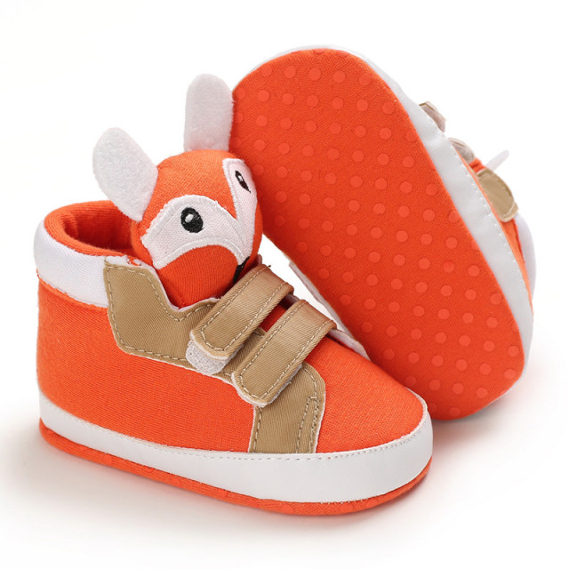 Marimi: 3 -6 luni ( lungime talpita la interior 10,5 cm, lungime talpita la exterior 11 cm) 6-9 luni ( lungime talpita la interior 11,5 cm, lungime talpita la exterior 12 cm) 9-12 luni (lungime talpita la interior 12,5 cm, lungime talpita la exterior 13 cm) Tenisi pentru baietei, in forma de vulpita, se inchid cu barete cu arici. Culoare: portocaliu Material: textil Talpa: textil cu inscriptie antiderapanta