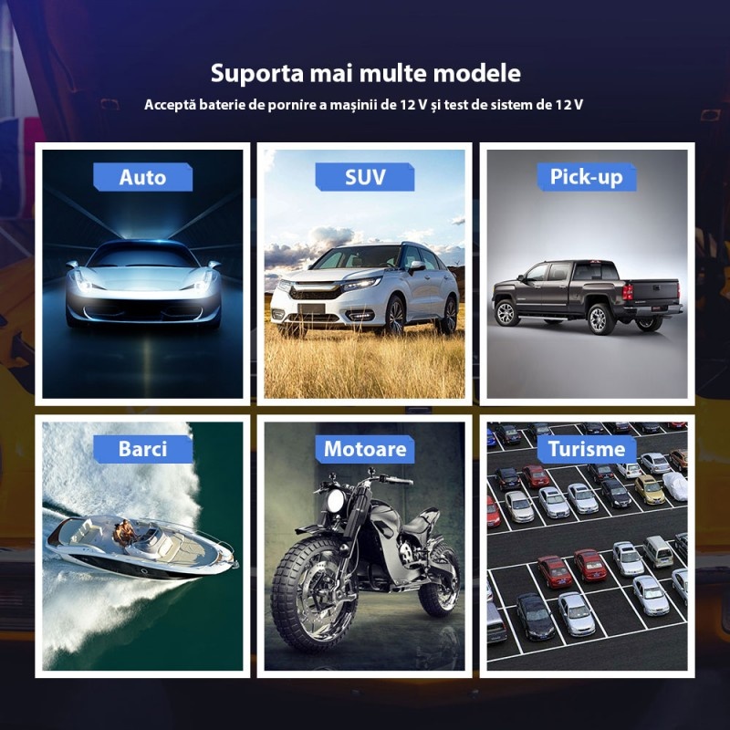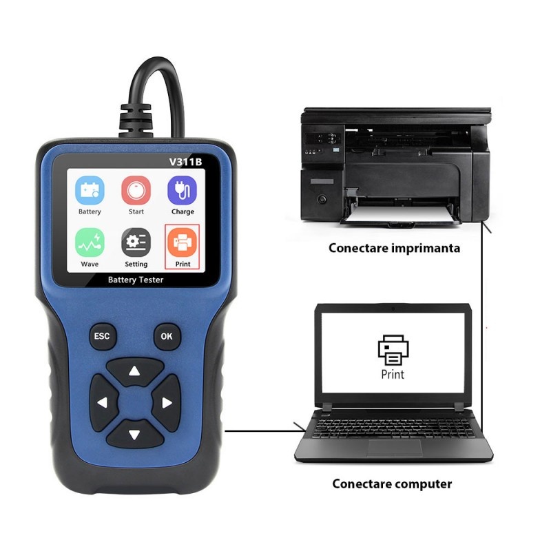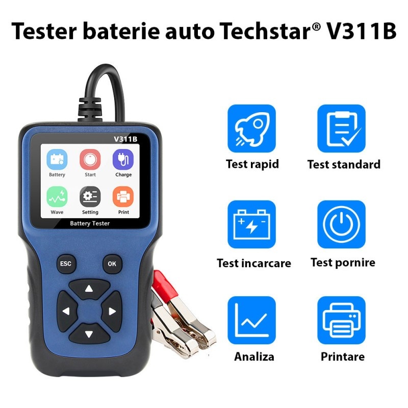 Vă faceți griji pentru durata de viață a bateriei în călătoria dumneavoastra? Testerul de baterie auto Techstar® V311B este foarte simplu de utilizat. Există mai multe tipuri de teste pe dispozitiv, doar apăsați butonul pentru a Selecta. Puteți verifica bateria atunci când o conectați la mașină sau puteți verifica bateria în afara mașinii. Cu tehnologia avansată de testare a conductanței, acest analizor digital de baterie vă poate oferi rezultate precise ale testării în câteva secunde. Cu testerul de baterie auto Techstar® V311B , puteți verifica starea generală de sănătate a bateriei, inclusiv testul de pornire și puteți efectua un test complet de încărcare a sistemului. Testul de pornire vă ajută să testați și să analizați modul de pornire pentru a verifica dacă funcționează corect sau nu, iar testul de încărcare este pentru a verifica starea sistemului si a evita deteriorarea bateriei din cauza supraîncărcării sau încărcării incomplete. Suportă 9 limbi care pot fi schimbate oricând: engleză, chineză, portugheză, italiană, franceză, germană, spaniolă, poloneză, rusă. Testerul de baterie auto Techstar® V311B funcționează pe toate bateriile de 12 volți. Baterii cu plumb-acid de 100 - 2000 CCA, inclusiv inundate obișnuite (baterie obișnuită), placă plată AGM (bateria tabletă AGM), spirală AGM (baterie de bobinare AGM) , baterii GEL și EFB. Rezultatele testelor se bazează pe standardele CCA, JIS, GB, SAE, MCA, CA, DIN, IEC, EN și BCI. Baterii cu ciclu adânc pentru vehicule, mașini, motociclete, camioane, RV-uri, ATV-uri, SUV-uri, bărci, iahturi, cositoare și chiar mașini de golf. Specificatii: Dimensiuni produs: 20,5 x 13,5 x 4,7 cm Greutate: 349 de grame Tip sursă de alimentare: Baterii 9V Display: 2.8 inch TFT rezolutie: 240 x 320