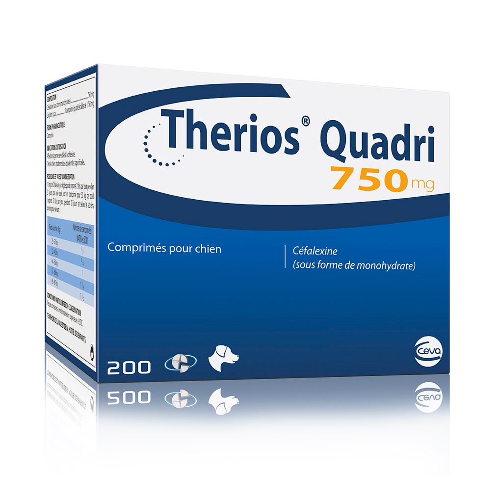 Therios - antibiotic oral sub forma de comprimate masticabile pentru caini, utilizat in tratamentul infectiilor bacteriene produse de microorganisme sensibile la cefalexina Categorie: Antibiotice. Producator: CEVA SANTE ANIMALE. Compozitia unui comprimat: Cefalexina (sub forma monohidrat) 300 / 750 mg. Specii tinta: caini. Indicatii terapeutice in tratarea infectiilor bacteriene cutanate produse de microorganisme sensibile la cefalexina; in tratarea piodermatitelor superficiale. Contraindicatii nu se administreaza la animale cu antecedente de hipersensibilitate la cefalexine sau la oricare alta substanta din grupul antibioticelore β-lactamice; nu se utilizeaza in caz de insuficienta renala severa; nu se utilizeaza la iepuri, porci de guineea, hamster si gerbili. Cale de administrare: pe cale orala. Doza recomandata: 15 mg cefalexina per kg greutate corporala, de 2 ori pe zi, timp de 21 zile. Timp de asteptare: nu este cazul. Conditii de depozitare A se pastra la o temperatura sub 25°C in ambalajul original. A se proteja de lumina si umiditate. Pentru mai multe detalii privind indicatiile produsului va rugam sa consultati prospectul.