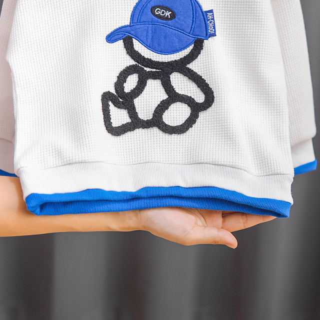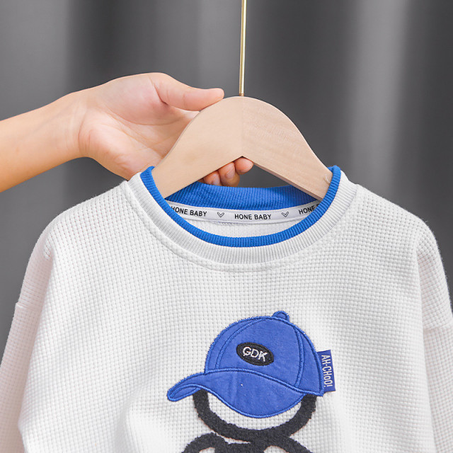 Marimi: 6-9 (80), 9-12 (90), 12-18 (100), 18-24 (110), 24 (120) luni Material: 95% Bumbac, 5% spandex Trening pentru baietei format din: - bluza alba cu maneca lunga, cu un ursulet cu sapca aplicat pe piept; - pantaloni albastri, cu buzunare si prevazuti cu elastic in talie. Pantofiorii din imagine sunt cu titlu de prezentare si nu sunt inclusi in pret.