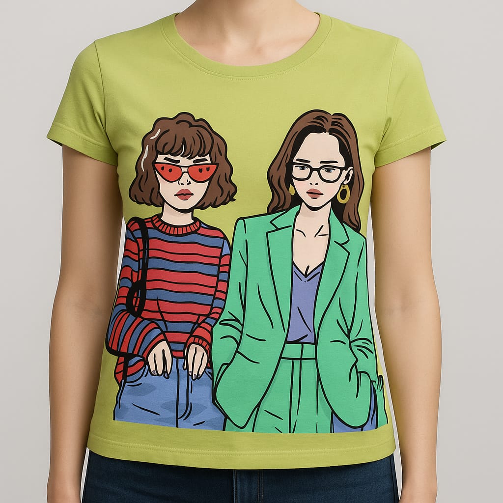 Tricoul pentru damă este confecționat din 100% bumbac, oferind un confort ridicat și o respirabilitate excelentă pentru purtare zilnică. Modelul are un croi regular fit, cu guler rotund și mâneci scurte, ideal pentru sezonul cald.Designul se remarcă prin imprimeul frontal colorat, reprezentând două femei stilizate în tonuri vii – una purtând o bluză în dungi roșii și ochelari roșii în formă de inimă, cealaltă într-un costum verde mentă și bluză mov. Fundalul tricoului este de un verde deschis/lămâie, adăugând o notă veselă și modernă.Este un tricou perfect pentru ținute casual, combinat cu blugi, fuste sau pantaloni scurți. Se poate spăla la mașină, păstrându-și forma și culorile vibrante datorită calității materialului natural.