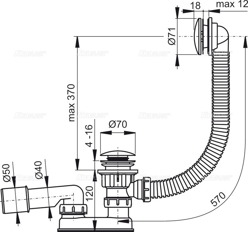 Aplicabilitate: Pentru a evacua apa din cadă Pentru căzi de baie cu dimensiuni standard Pentru căzi de baie cu scurgere de Ø52 mm Caracteristici / Specificatii Tehnice: Sifon anti miros: 50 mm Debit: 48,6 l/min Debit: 42 l/min Rezistența sifonului anti-miros la presiune: 588 Pa Rezistența termică: 95 ˚C Legătură pentru cadă cu preaplin Sifon anti miros umed cu cot rotativ Închiderea sifonului prin mecanism CLICK/CLACK Preaplin cu țeavă flexibilă Lungime sifon cadă 57 mm