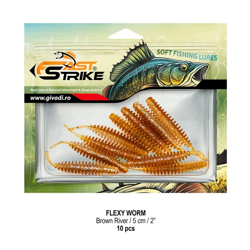 Fast Strike Flexi Worm 5cm, Brown River este o nălucă soft extrem de versatilă, concepută pentru pescuitul bibanului, păstrăvului și cleanului , dar foarte eficientă și la șalău și știucă atunci când peștii sunt apatici sau refuză momelile mai mari. Forma segmentată și coada subțire creează vibrații fine și bule de aer în timpul recuperării, imitând perfect un viermișor în mișcare. Materialul moale și elastic din care este realizat asigură o evoluție naturală, chiar și la cele mai mici impulsuri ale lansetei. Datorită culorii Brown River, Flexi Worm devine o alegere excelentă pentru ape tulburi sau condiții de lumină scăzută , oferind o vizibilitate crescută și declanșând atacuri reflexe. Poate fi montat pe Drop Shot, Cheburashka, Split Shot sau micro-jiguri , fiind ideal pentru tehnici de finețe. Impregnat cu aromă naturală de peștișor pradă și ambalat în blister rigid cu fermoar , își păstrează forma și calitatea în timp, chiar și după utilizări repetate. Caracteristici: ? Tip nălucă: vierme soft (worm) ? Specii vizate: biban, păstrăv, clean, șalău, știucă ⚙️ Material: silicon moale, elastic și rezistent ? Acțiune: vibrație fină, emisie de bule de aer Monturi compatibile: Drop Shot, Cheburashka, Split Shot, micro-jig ? Aromă: peștișor pradă, impregnată din fabrică ? Lungime: 5 cm ? Culoare: Brown River ? Ambalaj: blister rigid cu fermoar, 10 bucăți
