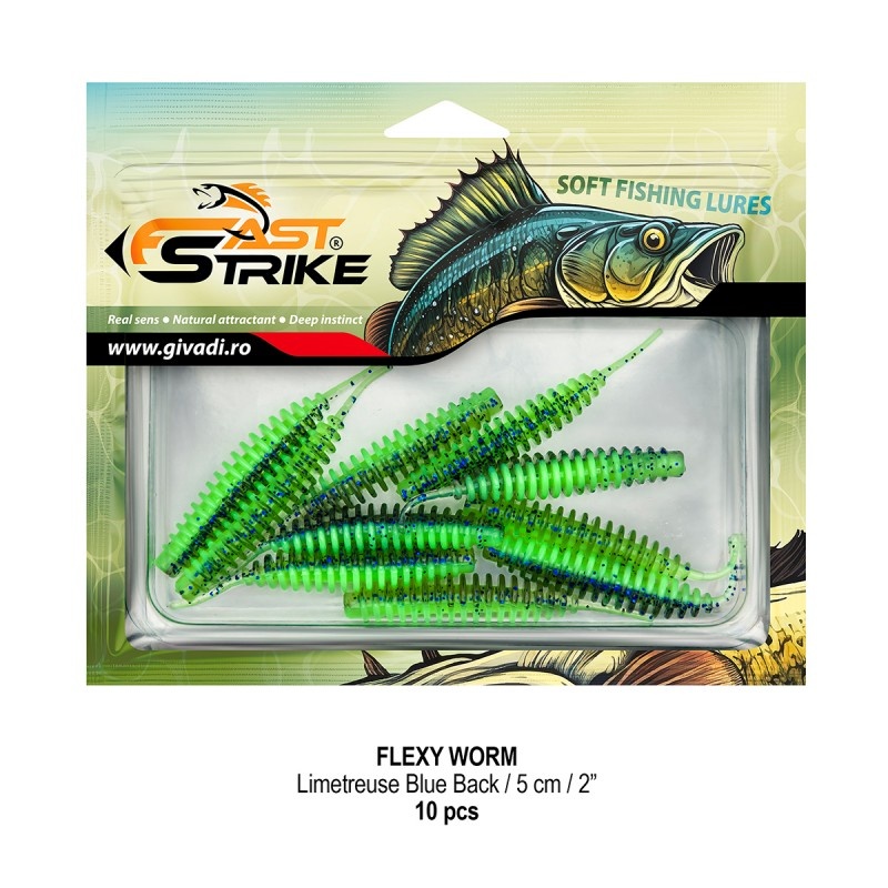 Fast Strike Flexi Worm 5cm, Limetreuse Blue Back este o nălucă soft extrem de versatilă, concepută pentru pescuitul bibanului, păstrăvului și cleanului , dar foarte eficientă și la șalău și știucă atunci când peștii sunt apatici sau refuză momelile mai mari. Forma segmentată și coada subțire creează vibrații fine și bule de aer în timpul recuperării, imitând perfect un viermișor în mișcare. Materialul moale și elastic din care este realizat asigură o evoluție naturală, chiar și la cele mai mici impulsuri ale lansetei. Datorită culorii Limetreuse Blue Back, Flexi Worm devine o alegere excelentă pentru ape tulburi sau condiții de lumină scăzută , oferind o vizibilitate crescută și declanșând atacuri reflexe. Poate fi montat pe Drop Shot, Cheburashka, Split Shot sau micro-jiguri , fiind ideal pentru tehnici de finețe. Impregnat cu aromă naturală de peștișor pradă și ambalat în blister rigid cu fermoar , își păstrează forma și calitatea în timp, chiar și după utilizări repetate. Caracteristici: ? Tip nălucă: vierme soft (worm) ? Specii vizate: biban, păstrăv, clean, șalău, știucă ⚙️ Material: silicon moale, elastic și rezistent ? Acțiune: vibrație fină, emisie de bule de aer Monturi compatibile: Drop Shot, Cheburashka, Split Shot, micro-jig ? Aromă: peștișor pradă, impregnată din fabrică ? Lungime: 5 cm ? Culoare: Limetreuse Blue Back ? Ambalaj: blister rigid cu fermoar, 10 bucăți