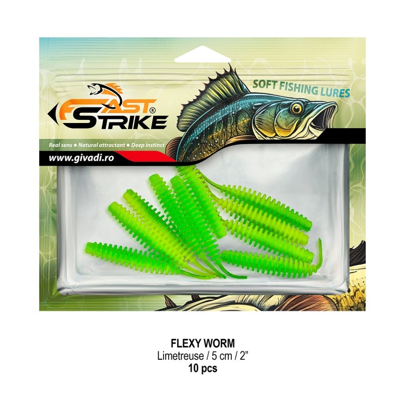 Fast Strike Flexi Worm 5cm, Limetreuse este o nălucă soft extrem de versatilă, concepută pentru pescuitul bibanului, păstrăvului și cleanului , dar foarte eficientă și la șalău și știucă atunci când peștii sunt apatici sau refuză momelile mai mari. Forma segmentată și coada subțire creează vibrații fine și bule de aer în timpul recuperării, imitând perfect un viermișor în mișcare. Materialul moale și elastic din care este realizat asigură o evoluție naturală, chiar și la cele mai mici impulsuri ale lansetei. Datorită culorii Limetreuse, Flexi Worm devine o alegere excelentă pentru ape tulburi sau condiții de lumină scăzută , oferind o vizibilitate crescută și declanșând atacuri reflexe. Poate fi montat pe Drop Shot, Cheburashka, Split Shot sau micro-jiguri , fiind ideal pentru tehnici de finețe. Impregnat cu aromă naturală de peștișor pradă și ambalat în blister rigid cu fermoar , își păstrează forma și calitatea în timp, chiar și după utilizări repetate. Caracteristici: ? Tip nălucă: vierme soft (worm) ? Specii vizate: biban, păstrăv, clean, șalău, știucă ⚙️ Material: silicon moale, elastic și rezistent ? Acțiune: vibrație fină, emisie de bule de aer Monturi compatibile: Drop Shot, Cheburashka, Split Shot, micro-jig ? Aromă: peștișor pradă, impregnată din fabrică ? Lungime: 5 cm ? Culoare: Limetreuse ? Ambalaj: blister rigid cu fermoar, 10 bucăți