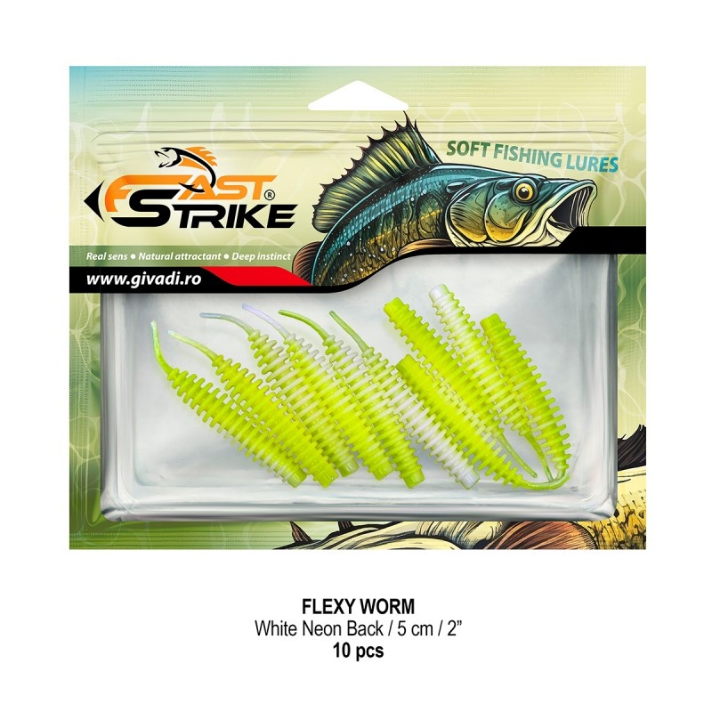 Fast Strike Flexi Worm 5cm, White Neon Back este o nălucă soft extrem de versatilă, concepută pentru pescuitul bibanului, păstrăvului și cleanului , dar foarte eficientă și la șalău și știucă atunci când peștii sunt apatici sau refuză momelile mai mari. Forma segmentată și coada subțire creează vibrații fine și bule de aer în timpul recuperării, imitând perfect un viermișor în mișcare. Materialul moale și elastic din care este realizat asigură o evoluție naturală, chiar și la cele mai mici impulsuri ale lansetei. Datorită culorii White Neon Back, Flexi Worm devine o alegere excelentă pentru ape tulburi sau condiții de lumină scăzută , oferind o vizibilitate crescută și declanșând atacuri reflexe. Poate fi montat pe Drop Shot, Cheburashka, Split Shot sau micro-jiguri , fiind ideal pentru tehnici de finețe. Impregnat cu aromă naturală de peștișor pradă și ambalat în blister rigid cu fermoar , își păstrează forma și calitatea în timp, chiar și după utilizări repetate. Caracteristici: ? Tip nălucă: vierme soft (worm) ? Specii vizate: biban, păstrăv, clean, șalău, știucă ⚙️ Material: silicon moale, elastic și rezistent ? Acțiune: vibrație fină, emisie de bule de aer Monturi compatibile: Drop Shot, Cheburashka, Split Shot, micro-jig ? Aromă: peștișor pradă, impregnată din fabrică ? Lungime: 5 cm ? Culoare: White Neon Back ? Ambalaj: blister rigid cu fermoar, 10 bucăți