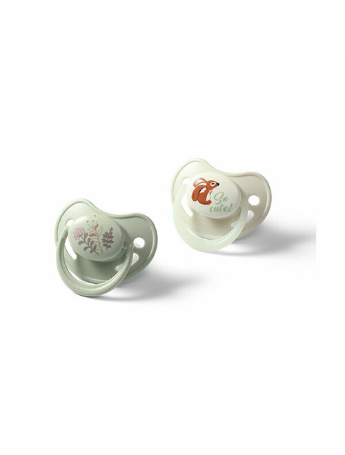 Set 2 suzete bebelusi, BabyOno, 6 18 luni, Anatomice, Maner fosforescent, Fara BPA, Scut ventilat Air Flow, Usor de sterilizat, Verde/ Bej