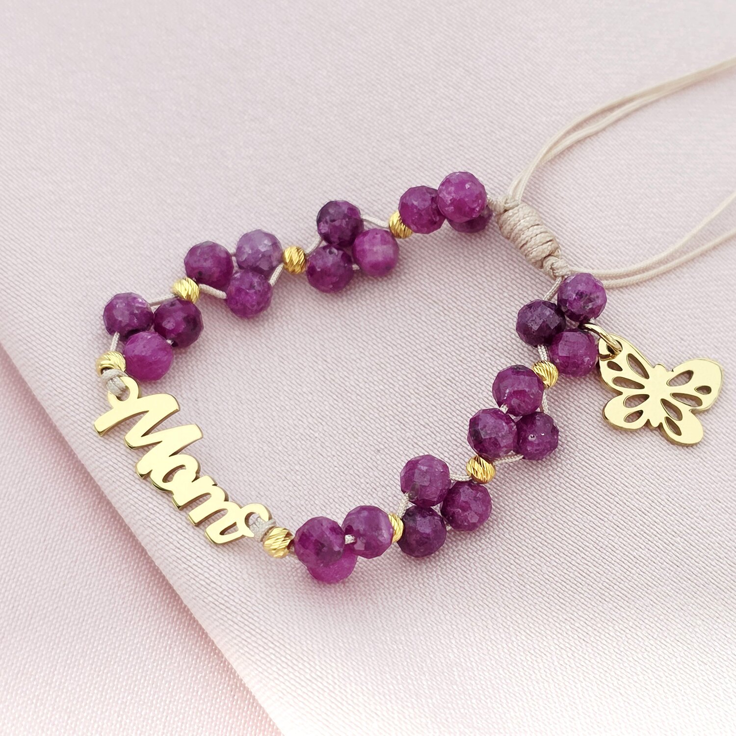 Bratara Vitalitate - Legatura materna - Mom, charm fluture si bilute din Argint 925 placat cu Aur Galben 18k - Pietre semipretioase Rubin fatetat - Snur nude