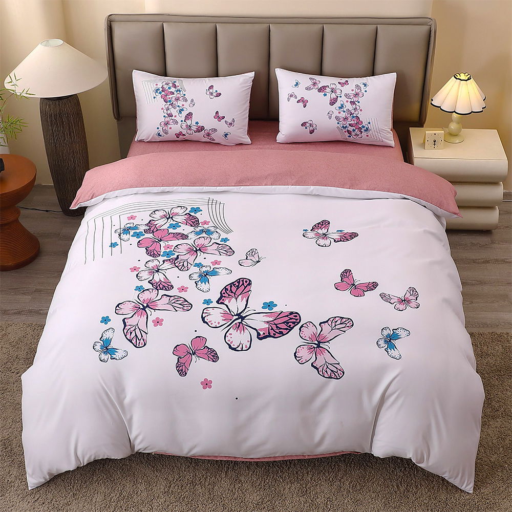 Lenjerie Alba cu Fluturi Roz si Albastri din Finet 5D cu Cearceaf Elastic 160/180x200cm, 4 Piese - LFDEB_A116C