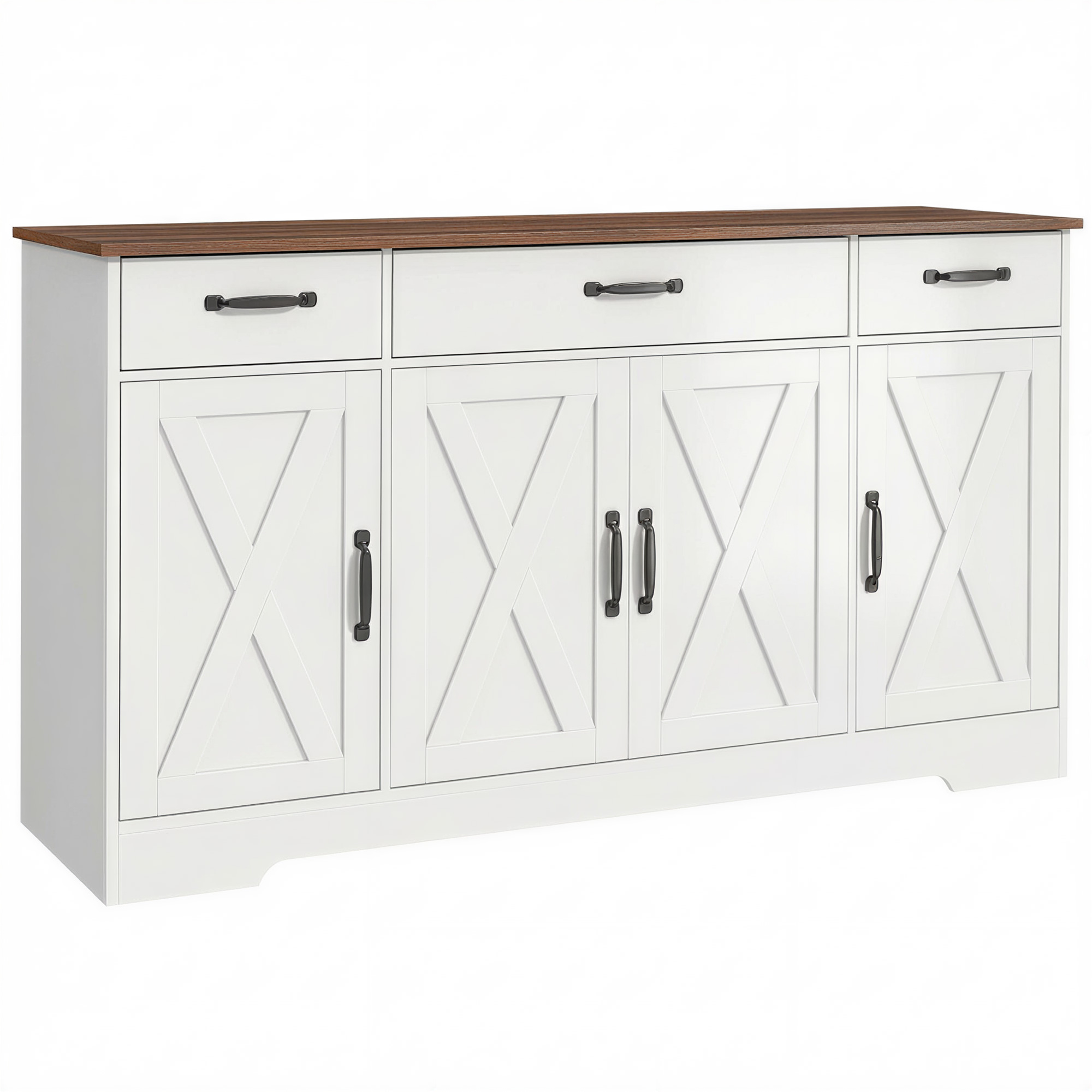 HOMCOM Bufet, mobilier de depozitare pentru bucătărie în stil rustic cu 4 uși tip hambar, 3 sertare, etajere reglabile, alb | Aosom Romania