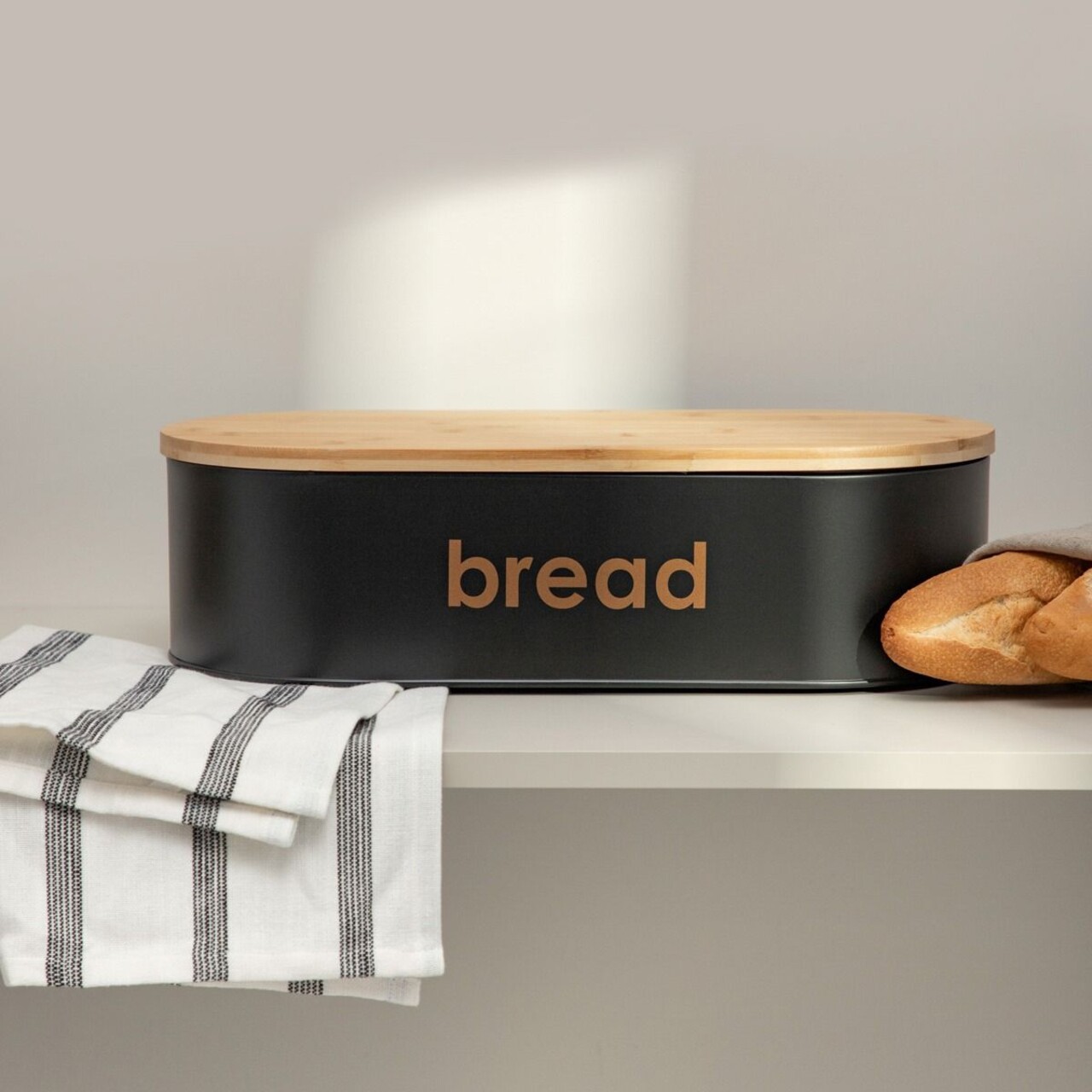 Cutie depozitare paine Parma Large, Homla, 44x21x12 cm, metal/bambus, negru/natur